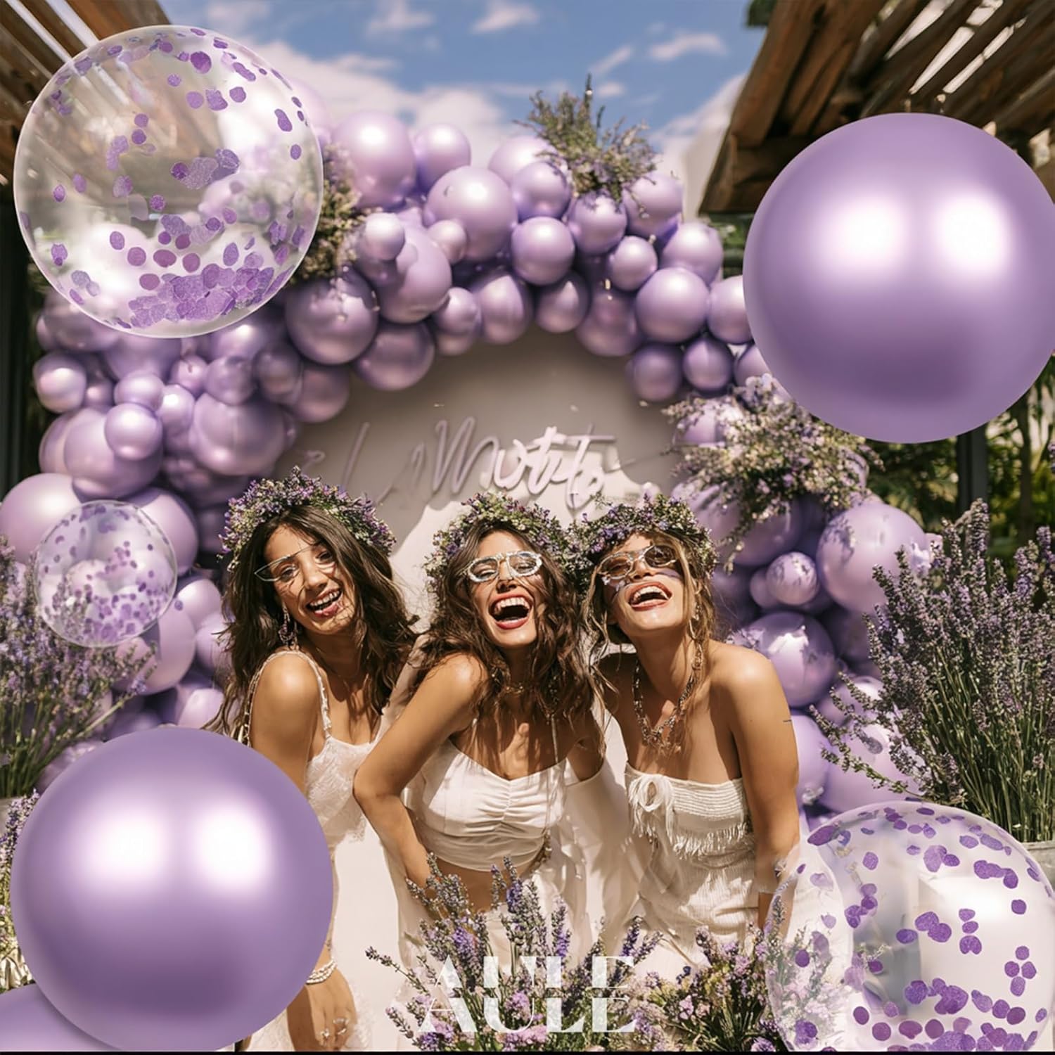 AULE Party Balloons Pack of 42 - Metallic Lavender Balloons and Confetti Latex Helium Balloons With 64ft Ribbons - 12 Inch Lilac Chrome Balloon Decoration Set