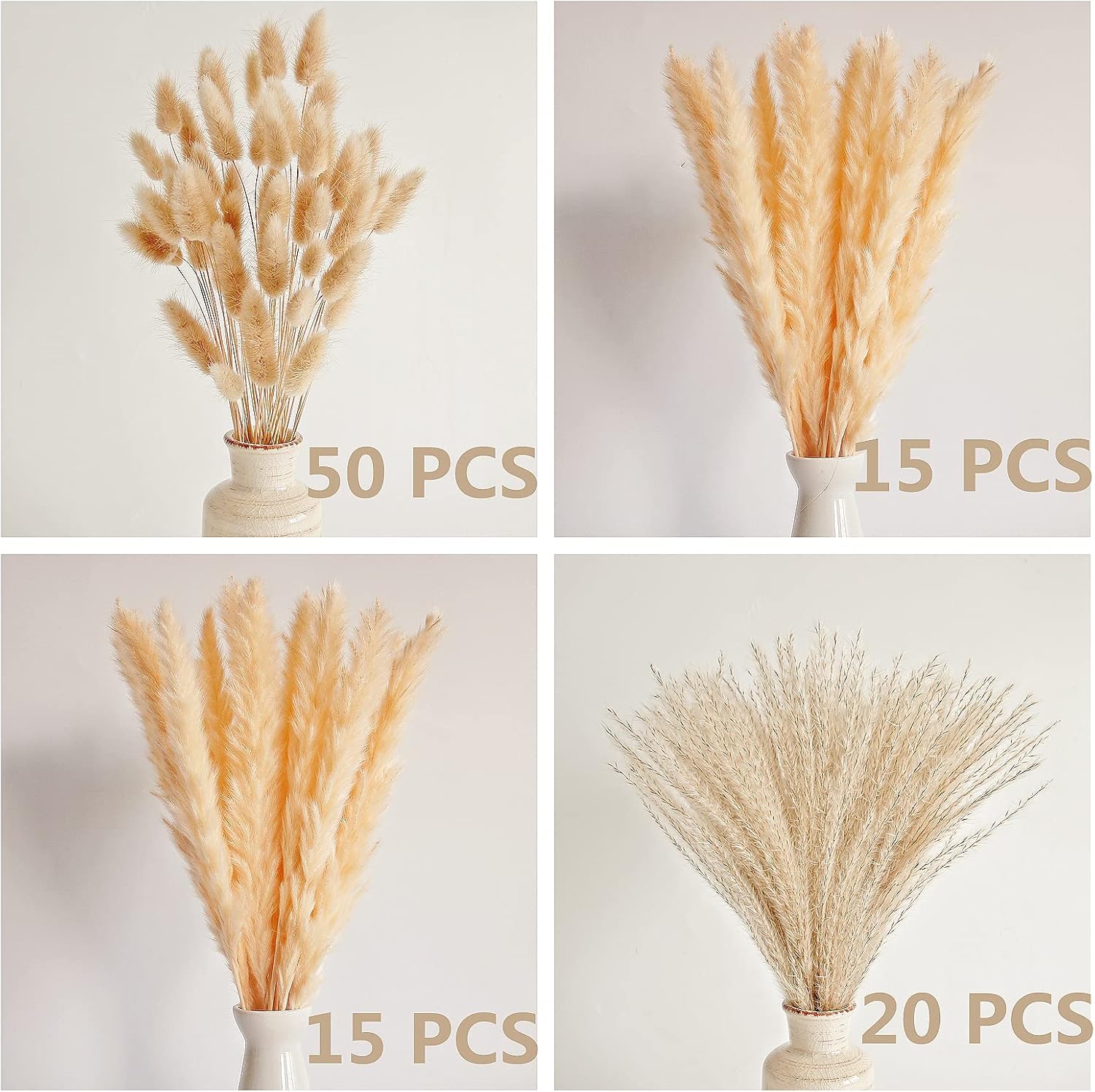 • More then one kind of pampas grass bouquet: carefully selected natural dried pampas grass decor, try to avoid deformation and breakage of dried pampas grass, 100 pieces of pampass grass contain 50 small pampas grass, 20 reed grass, 30 white pampas grass decor, (pampas grass vase not included) fill your vase, you can match it with different dried pompas floral bouquets according to your preference