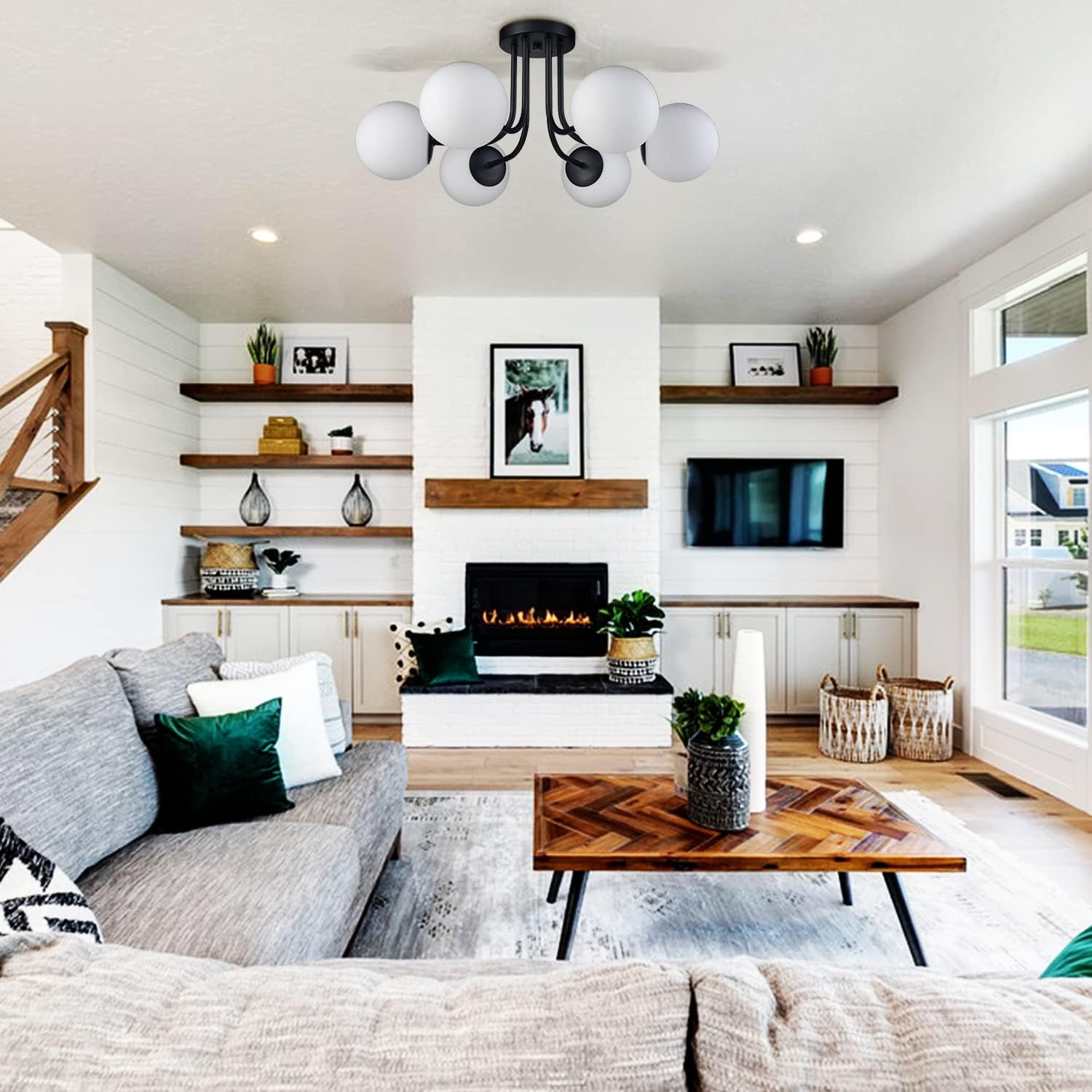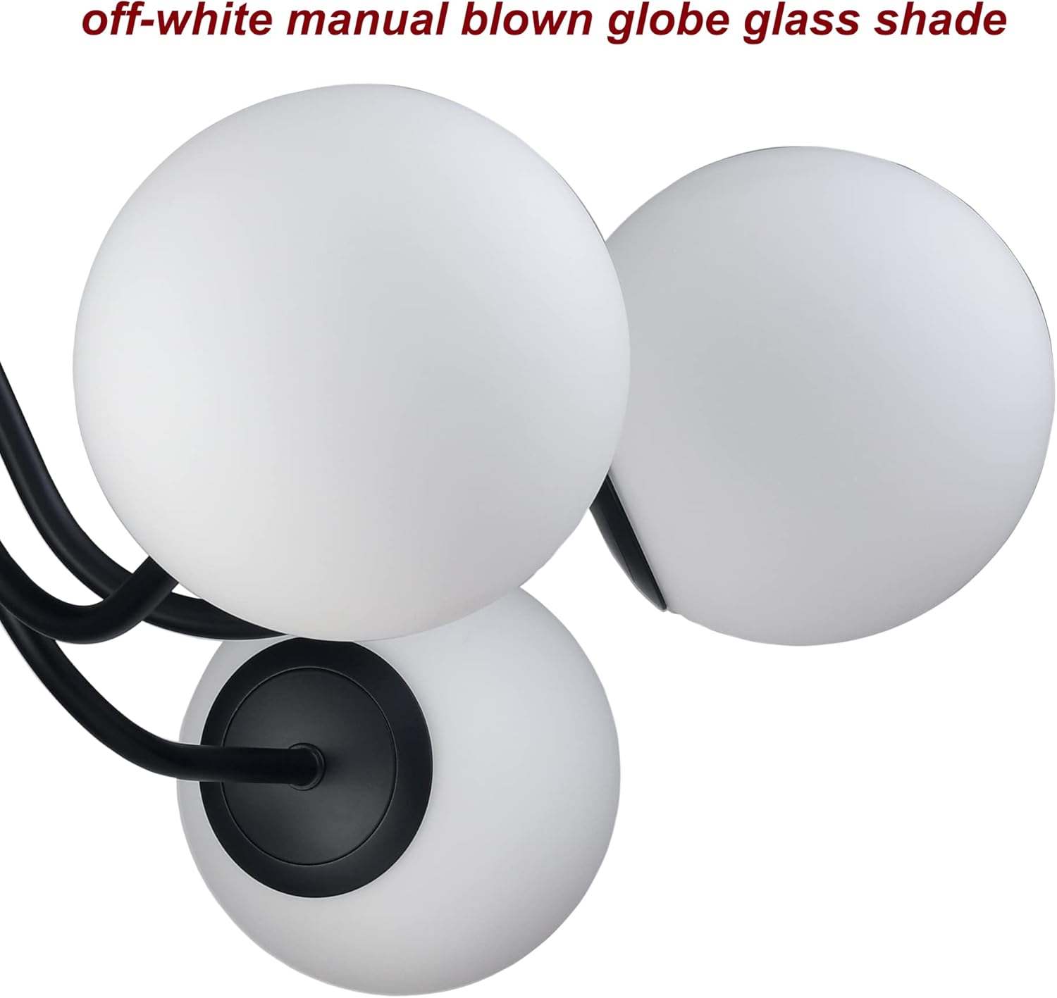 • 6-light matte black semi flush mount ceiling light made of high quality metal,which features 220-degree high-temperature baking varnish craft for strong adhesion.Crafted from globe opal manual blown glass shade,that offering more uniform and soft lighting without shadows.