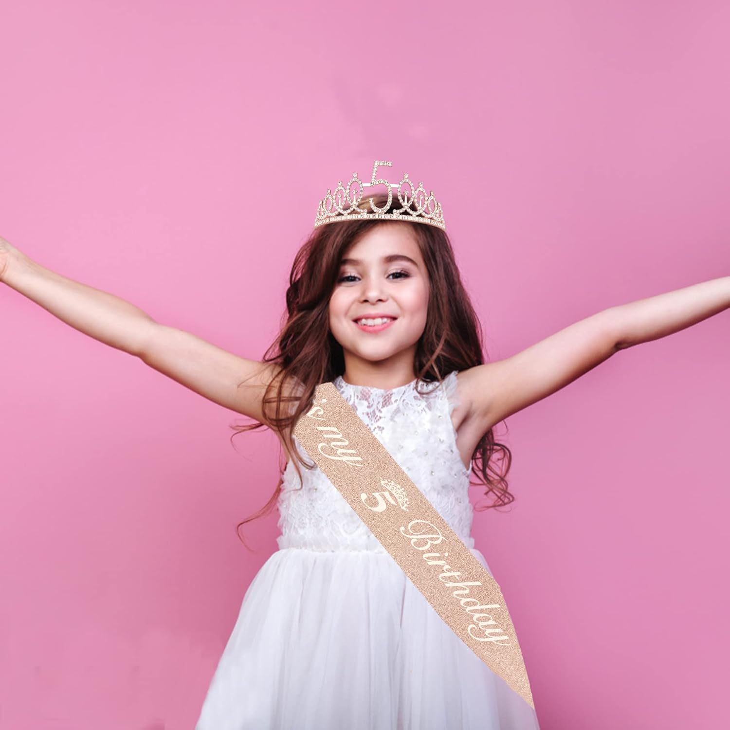 • 【5 Birthday Decorations for Girls】: 5th Birthday Sash for Girls *1pc, Crown for Kids*1pc, Happy 5th Birthday Cake Topper *1pc, Numeral 5 Birthday Candle *1pc