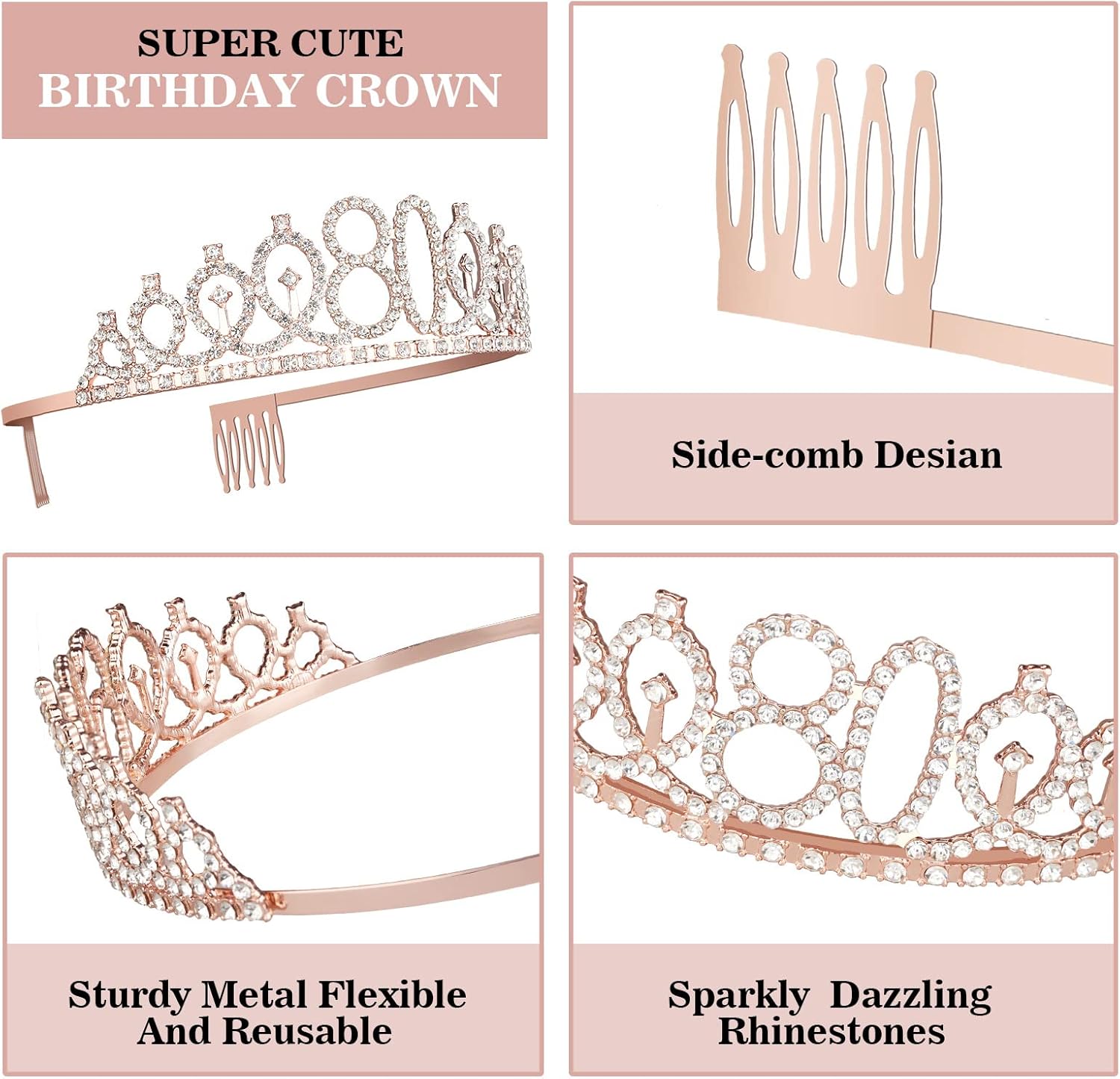 • 80th Birthday Crown for Women: Made of high quality alloy and rhinestone. Rose gold 80th birthday tiara with combs that make sure it can grip the hair more tightly for fitting women. Dimension: 5.12” on the front side