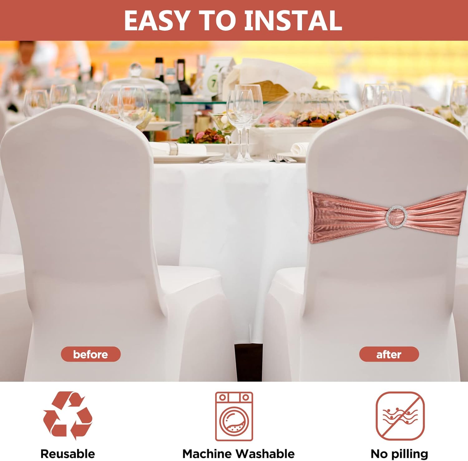 CHENGU 150 Pieces Spandex Stretch Chair Sashes Bows Elastic Chair Cover Bands Ties with Buckle Slider for Wedding Party Reception Events Universal Ceremony Banquet Decorations (Rose Gold)
