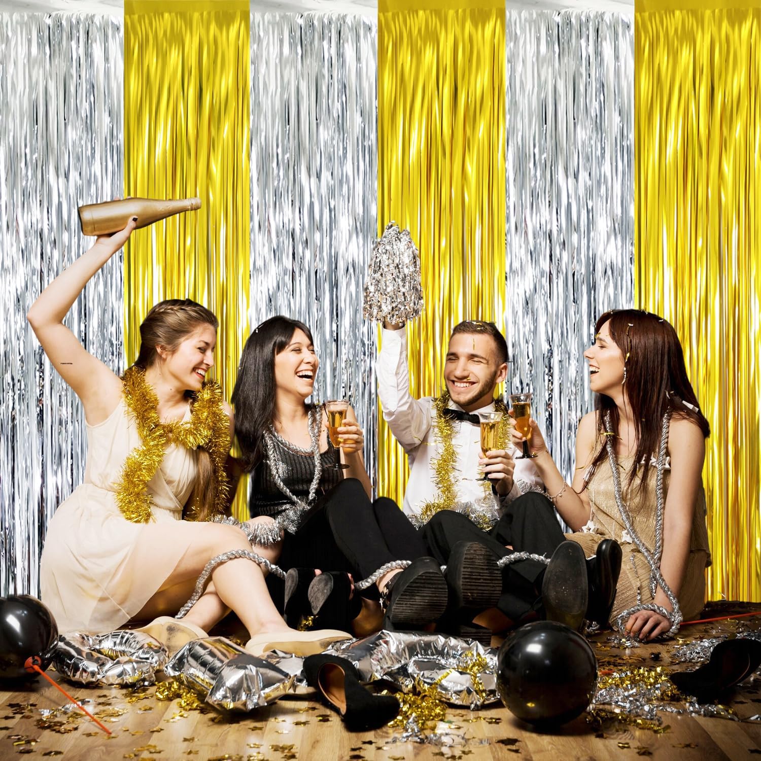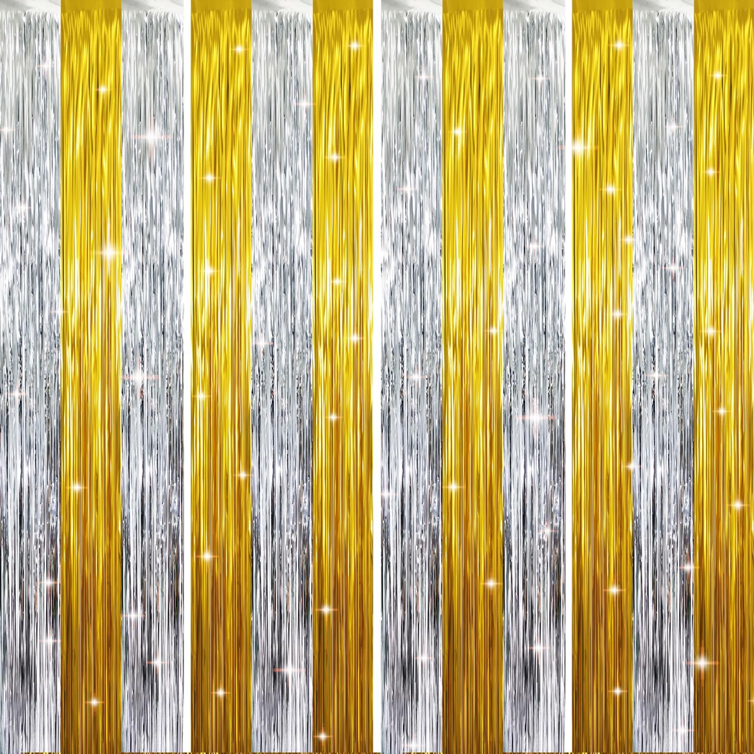 • Package Includes:4 pack Gold&Silver foil fringe curtains,3.2 ft x 8.2 ft each,suitable for hanging on a door or coverage a wall fully