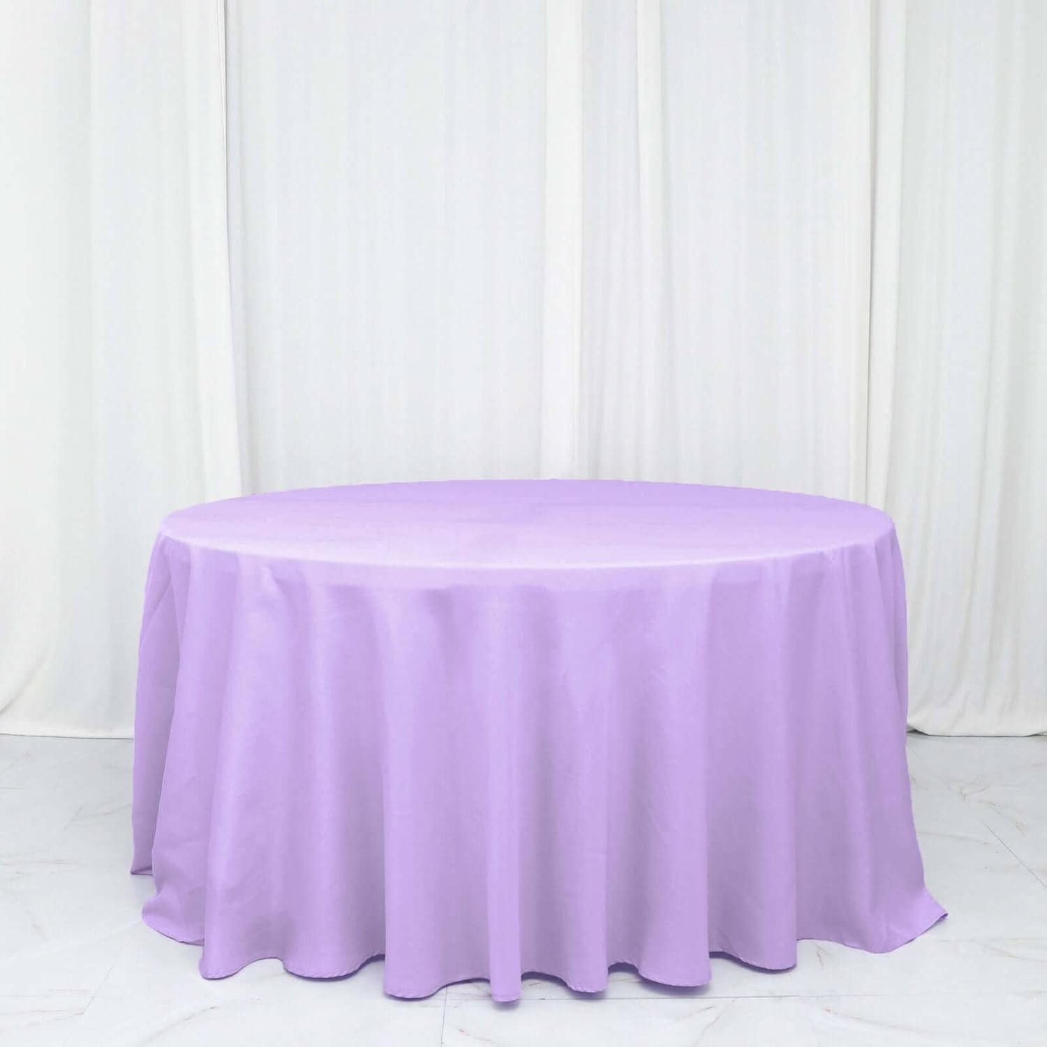 • Quantity: 1 Tablecloth Material: 100% Polyester Color: Lavender Size: 132" Dia. 1 pc, seamless design Stain & Wrinkle Resistant, Machine Washable Hemmed edges for an exquisite look. Gives floor length hang on standard 6 ft (72") tables