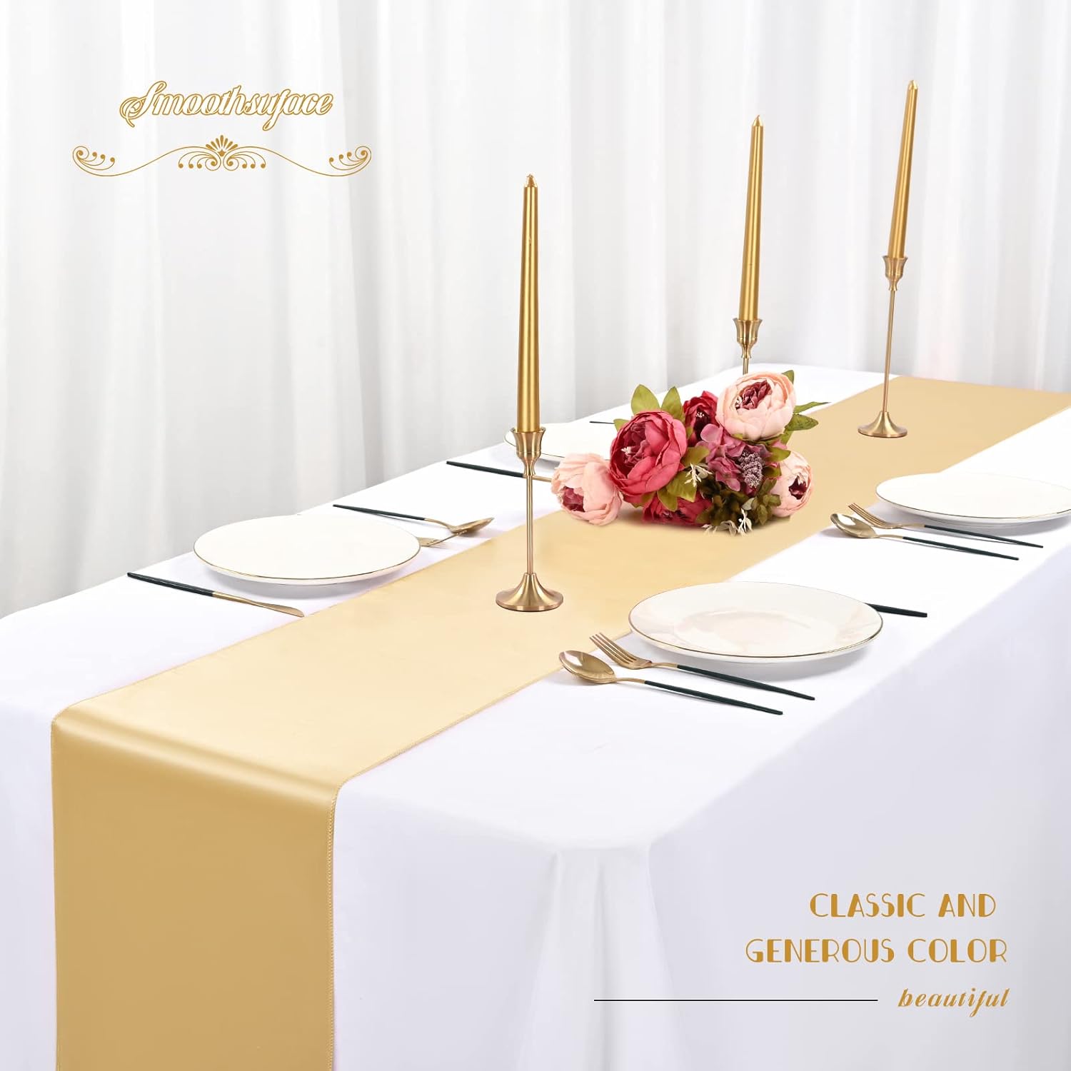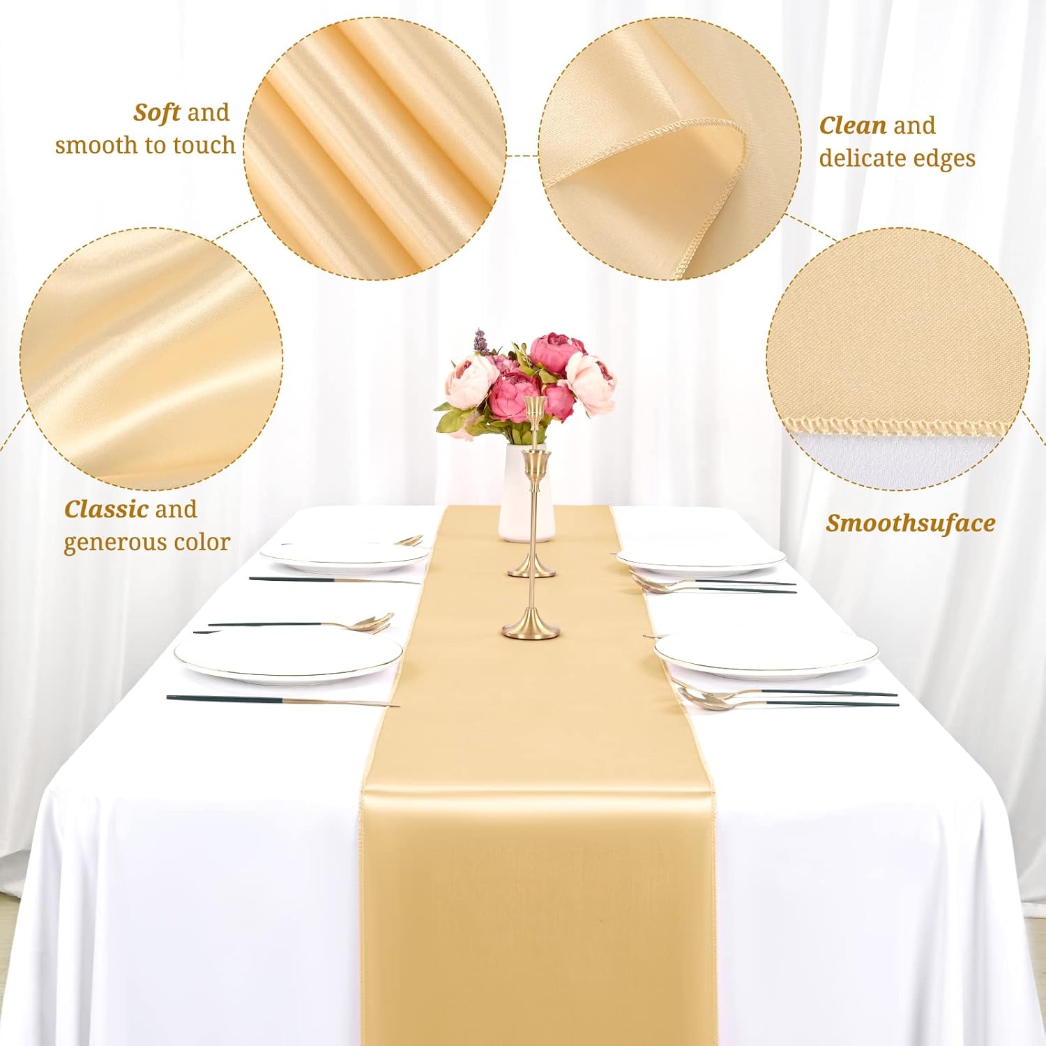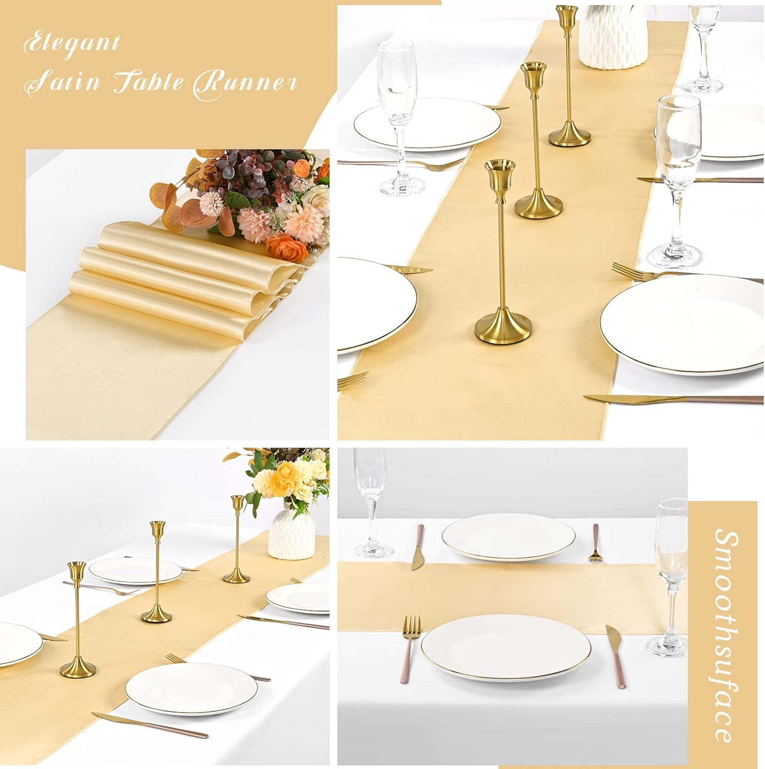 • 👑【Set includes】12Pack champagne gold satin table runner measures 12" x 108" in size, appropriate for a table that can seat 8-10 people. This satin table runner can fit a 6ft/8ft rectangular table or round table well.This satin table runner is great for event table decorations.Our satin table runner make your dining table more dazzling and outstanding.Purchase our 12piece satin table runner and save even more.