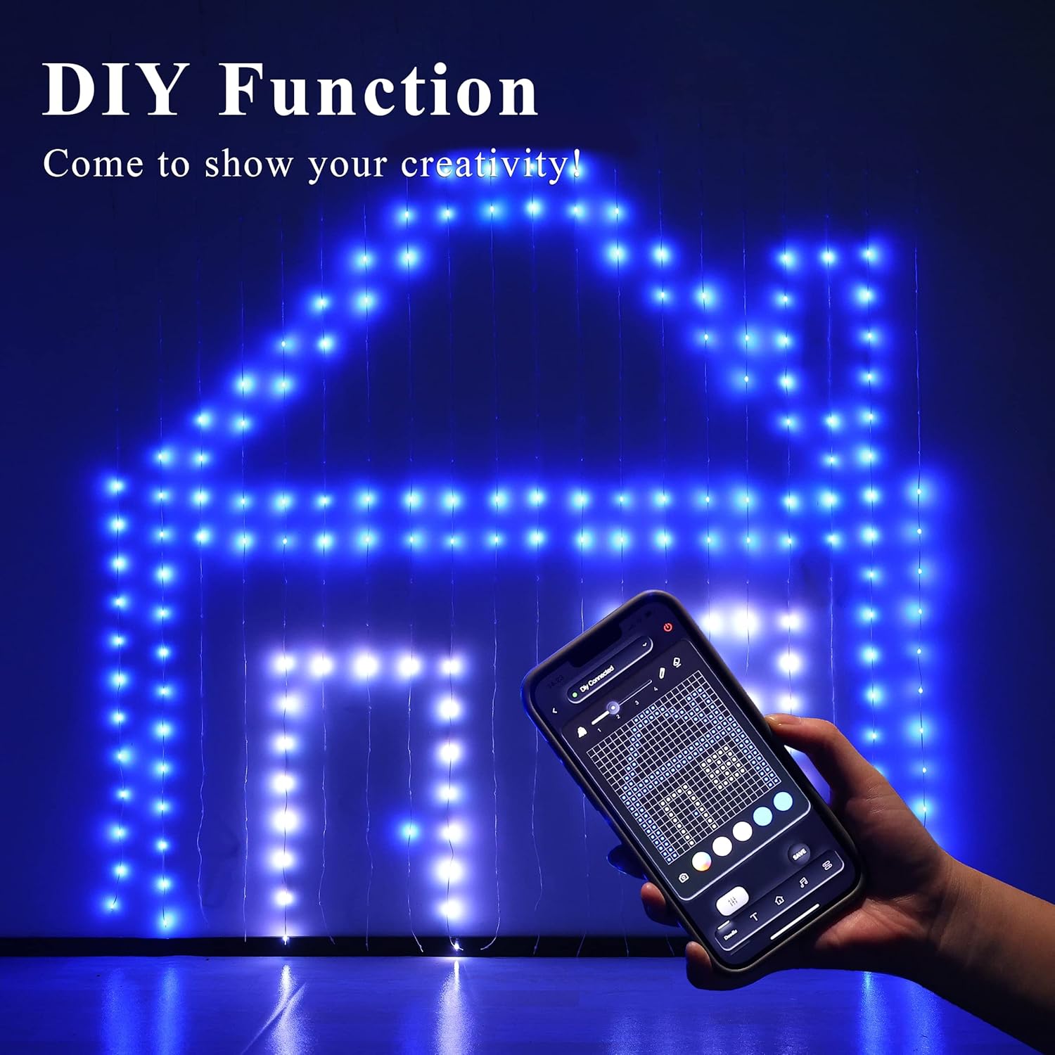 • Multiple light modes and DIY function- The lights have multiple animation options, including pumpkins, skulls, Santa Claus, Deer, Maple Leaf, the American flag, Meteor showers, snows, hearts, and other animations. It can be both daily and festival decorations. There are 12 fixed color and RGB color selection areas on the APP, you can choose colors, draw, or enter text to meet your needs of personalizing and customizing, creating unlimited ideas in the color-changing curtain lights.