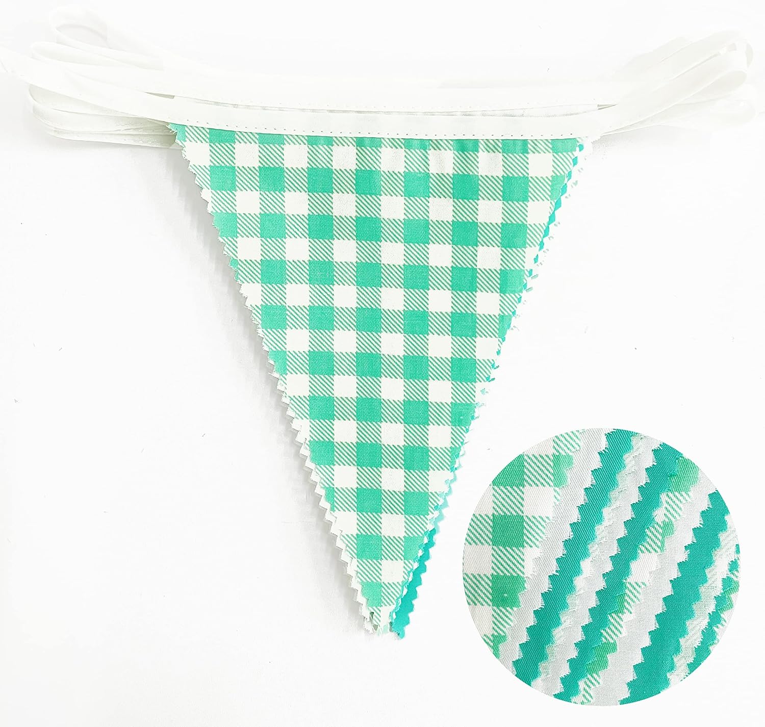 • Package Including:1 pack green buffalo plaid checkered gingham fabric bunting banner garland in light aqua green and white colors, with 36pcs flags in 10M/32.8Feet. Flag Size: 5.5in width x 7in height.