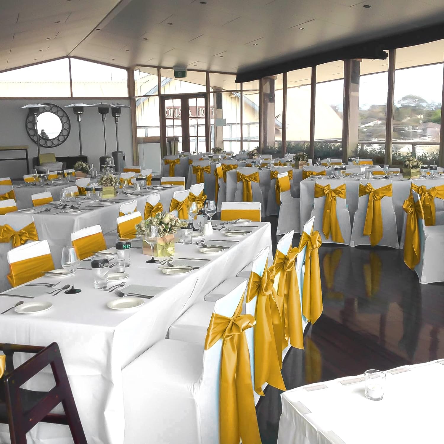 fani 60 PCS Gold Satin Chair Sashes Bows Universal Chair Cover for Wedding Reception Restaurant Event Decoration Banquet,Party,Hotel Event Decorations (7 x 108 inch)