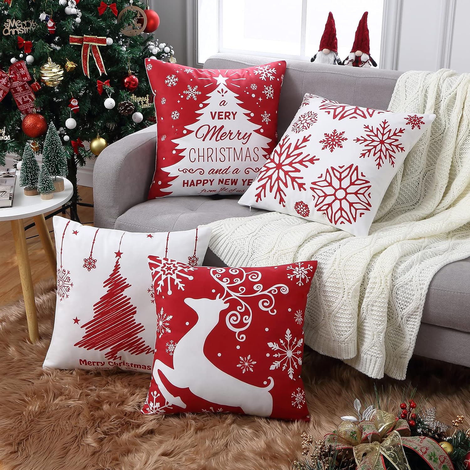 Christmas Pillow Covers 20x20 Set of 4 Farmhouse Christmas Tree Throw Pillow Case Snowflake Reindeer Decoration for Winter Holiday Decor Throw Cushion Case for Home Sofa Couch, Red and White