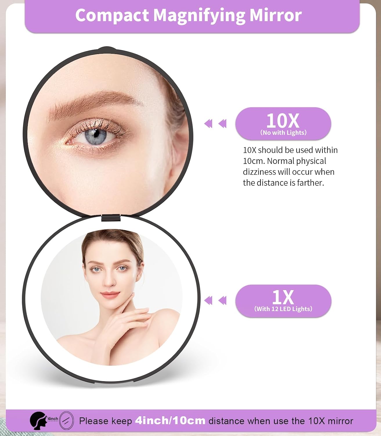 • 10x Magnifying:10x compact magnifying mirror, better magnification of facial details,which is good for makeup needs, shaving, or deep cleaning.Tip: When using the 10x magnifying mirror, please keep a distance of less than 10 cm, otherwise it may cause normal dizziness and affect imaging