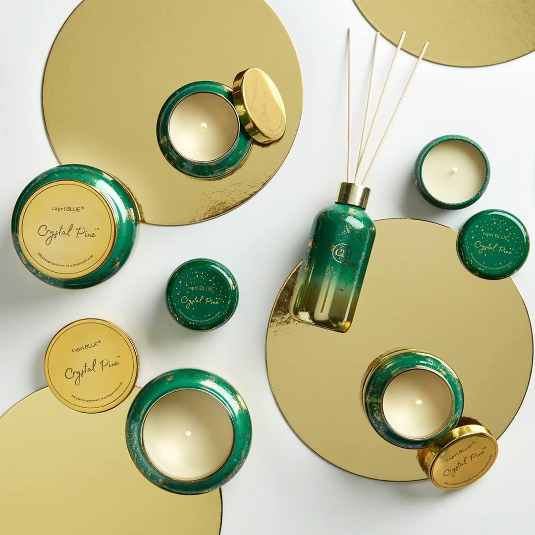 Capri Blue Glimmer Mini Tin - Crystal Pine Scented Candle with Mini Tin Candle Holder - Soy Wax Blend - Capri Blue Crystal Pine Emerald Green and Gold (3 oz)