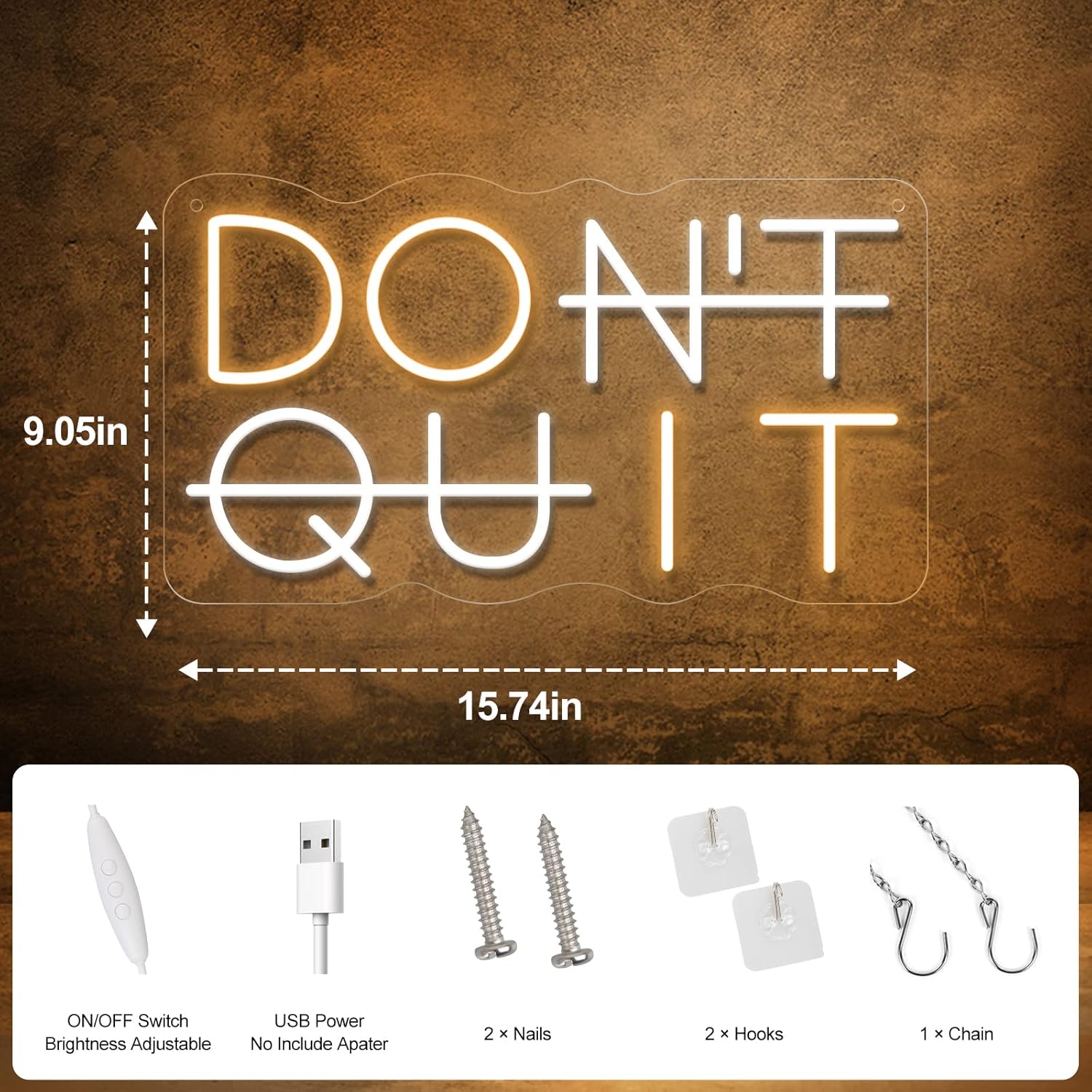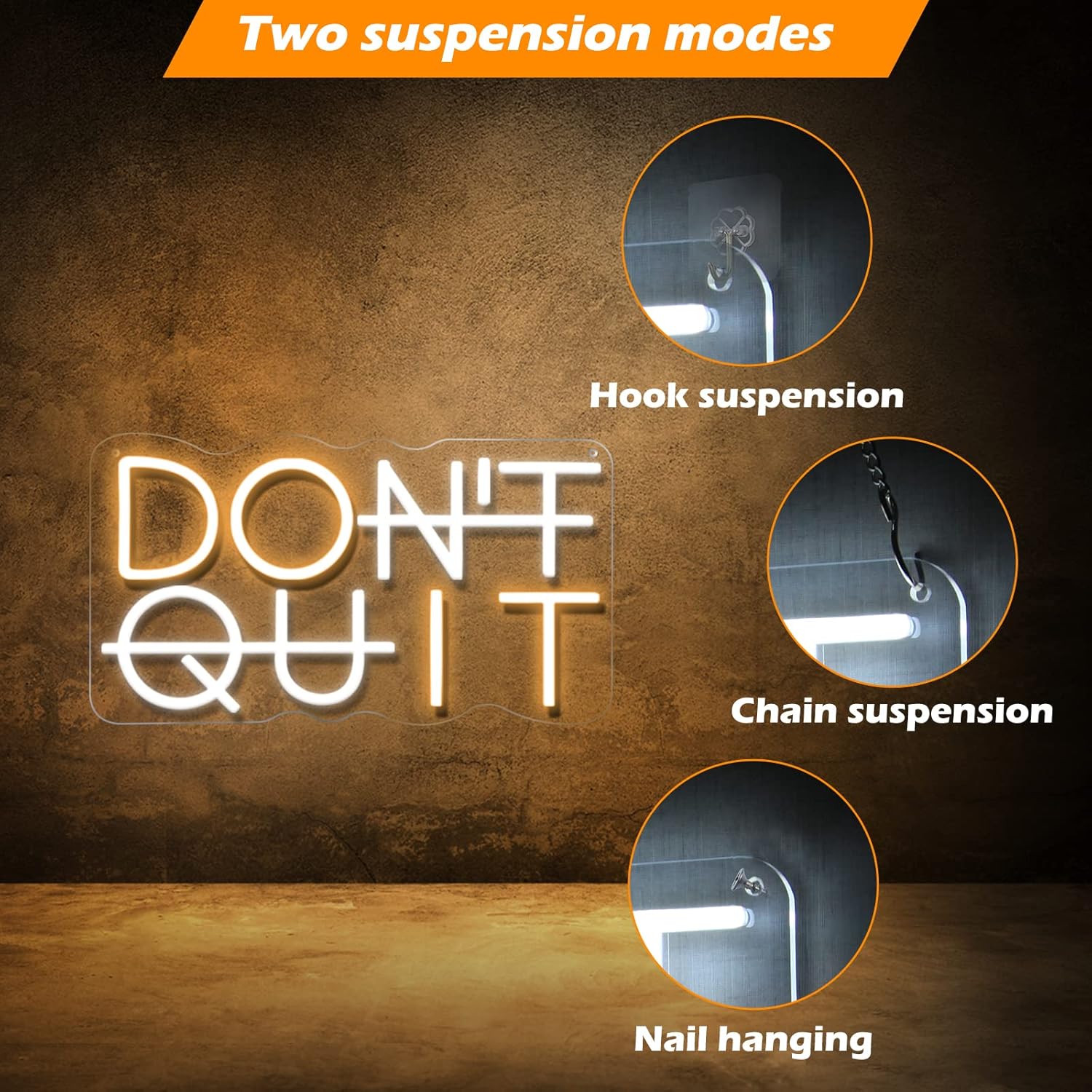 • Style & Material: The sign of Don't Quit (it also means to DO IT, don't give up)neon light is an exquisite artistic neon light decor sign. The LED neon light's combination of yellow and white is novel. The Neon Signs are made of Acrylic LED, Silicon Strips, and ABS Material, with No risk of glass breakage or leakage of hazardous materials