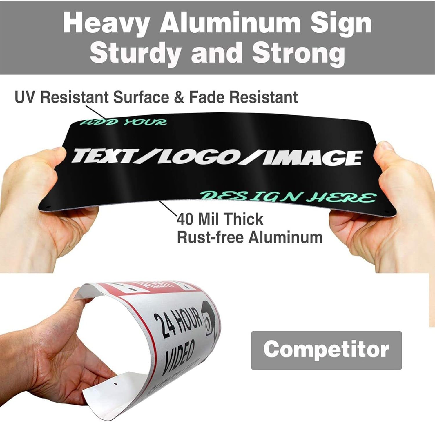 • 12 x 8 inch aluminum custom metal sign with 4 pre-drilled holes on the side that can be easily attached to any surface such as walls, doors or fences with cable ties or screws.