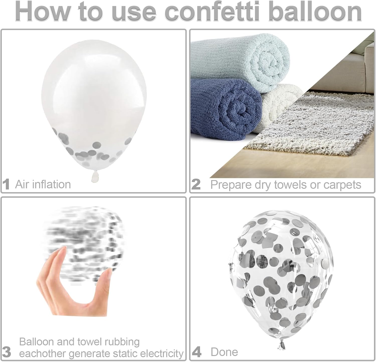 • 【How to Make Silver Confetti Balloon】- These silver confetti latex balloons can inflate hydrogen, helium ( it will float for more than 12 hours), and air. The best way to rub the surface of the balloons is with a dry towel or hair and silk. And it is recommended to use a pump to quickly inflate so that confetti is easier to be stuck.