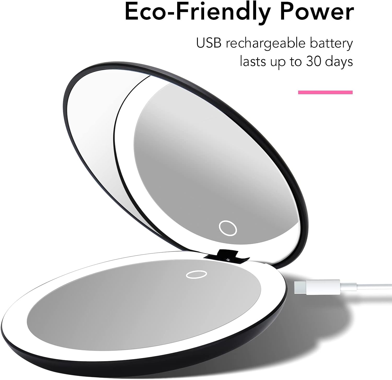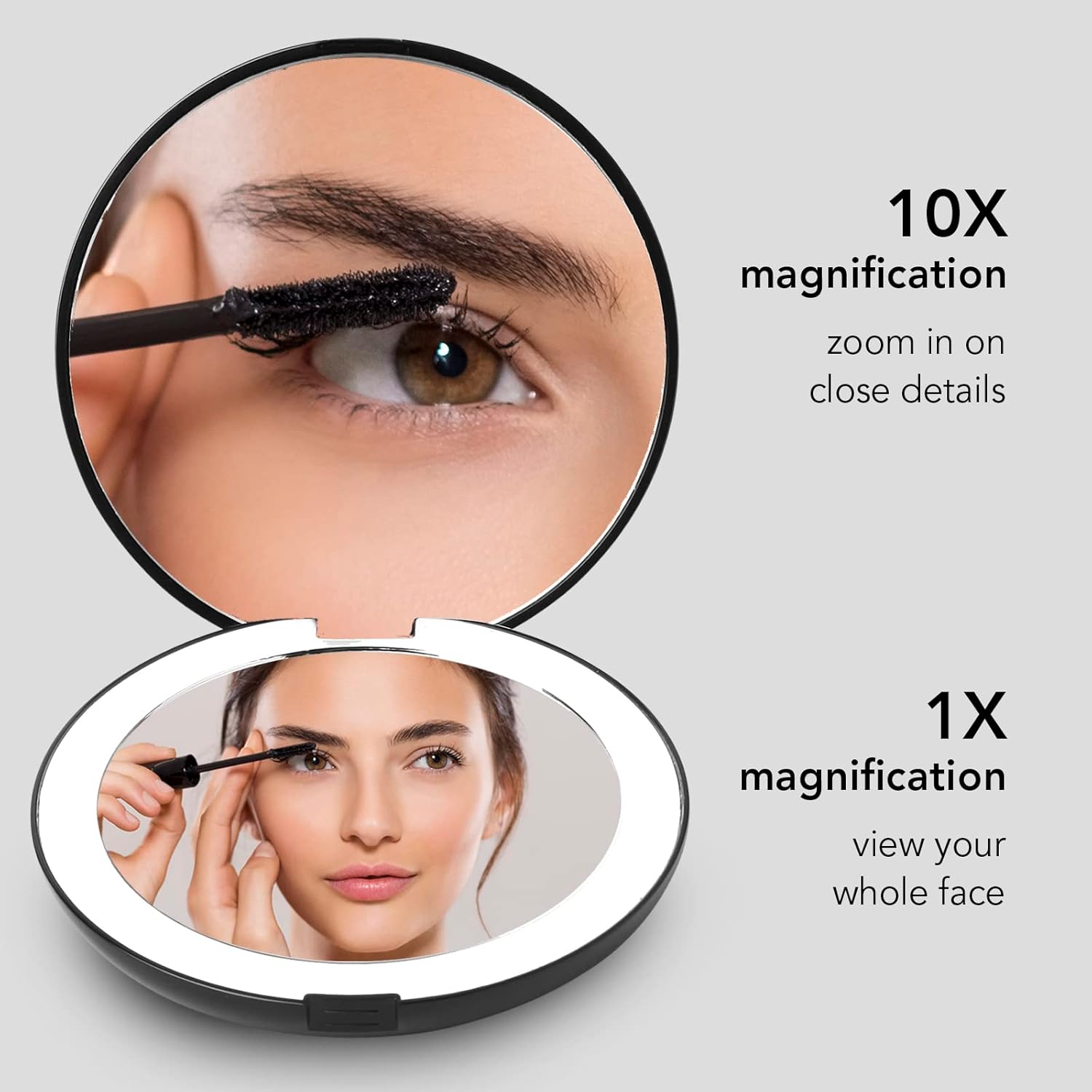 • Fancii Led Lighted Travel Makeup Mirror, Rechargeable With 10x/1x Magnifying & 3 Light Settings - Compact, Portable, Large 5” Wide Hand Mirror for Handbag and Purses (Black)