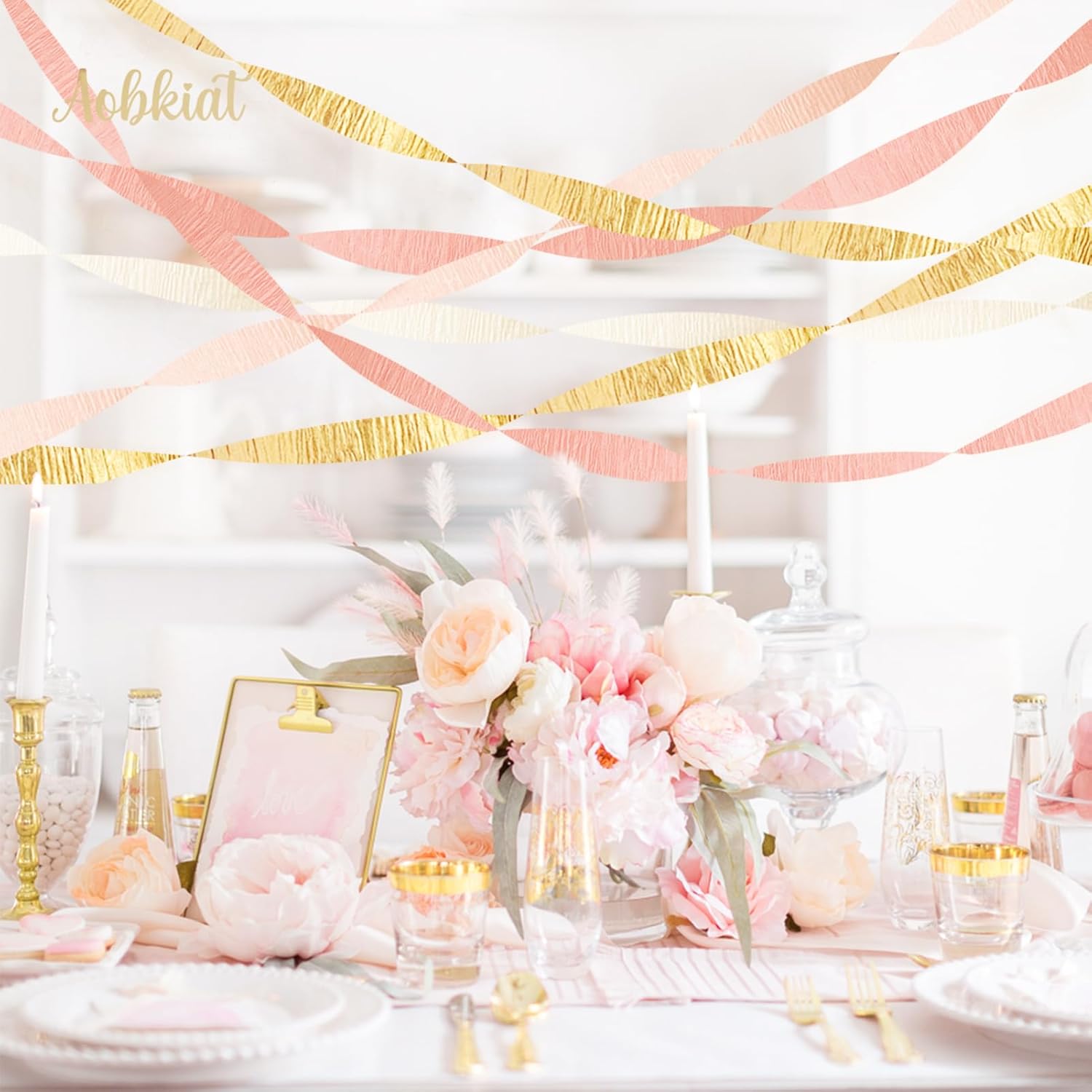 AOBKIAT Wedding Party Decorations, 8 Rolls Pink Gold Crepe Paper Streamers for Wedding, Bachelorette, Birthday, Baby Bridal Shower, Valentines Day Party Backdrop Decorations, 82ft Long