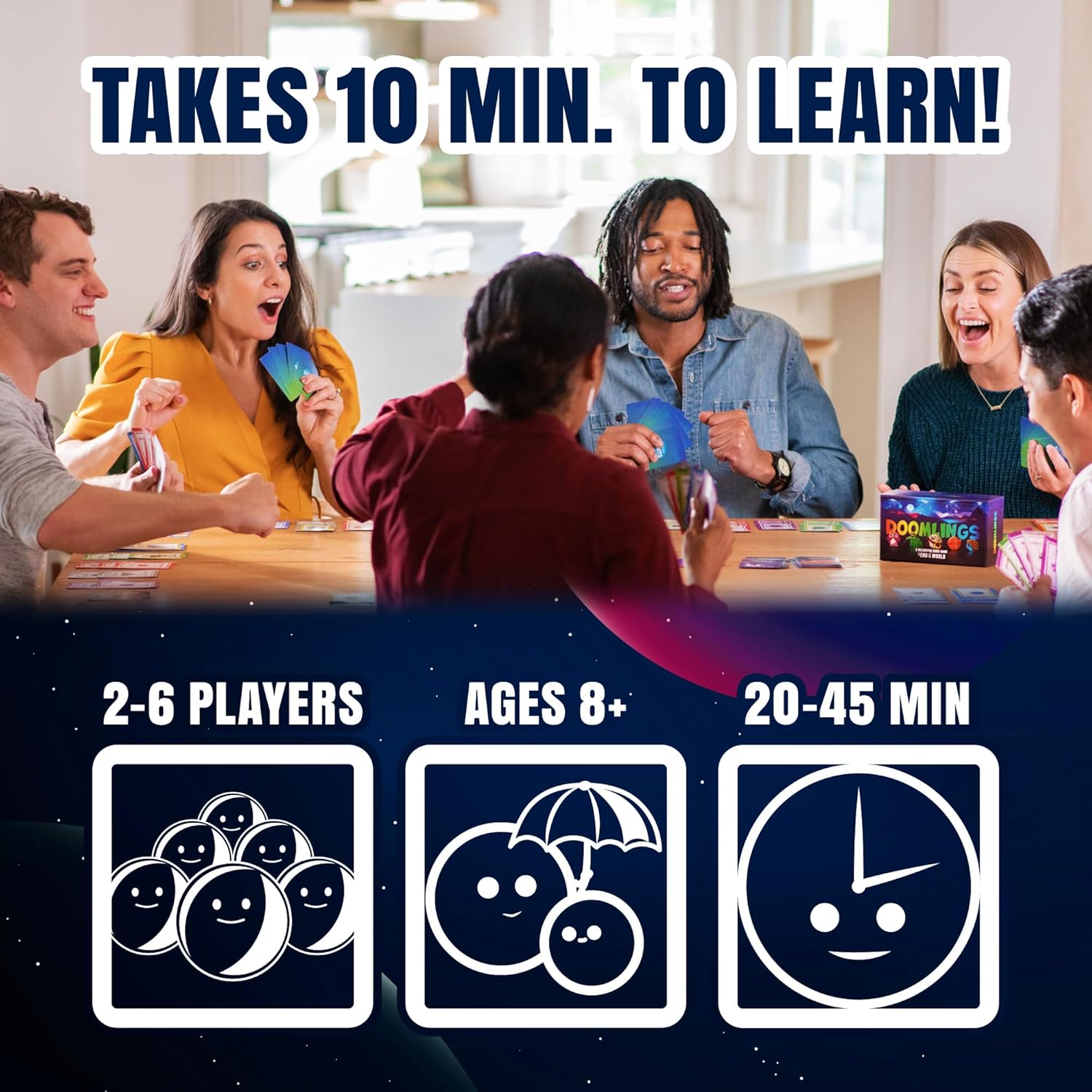 • Who's it For? Perfect for game night enthusiasts, families, or anyone who enjoys a good laugh with a healthy dash of strategy! Doomlings is perfect for 2-6 players, ages 8+, making it fun for adults and kids alike