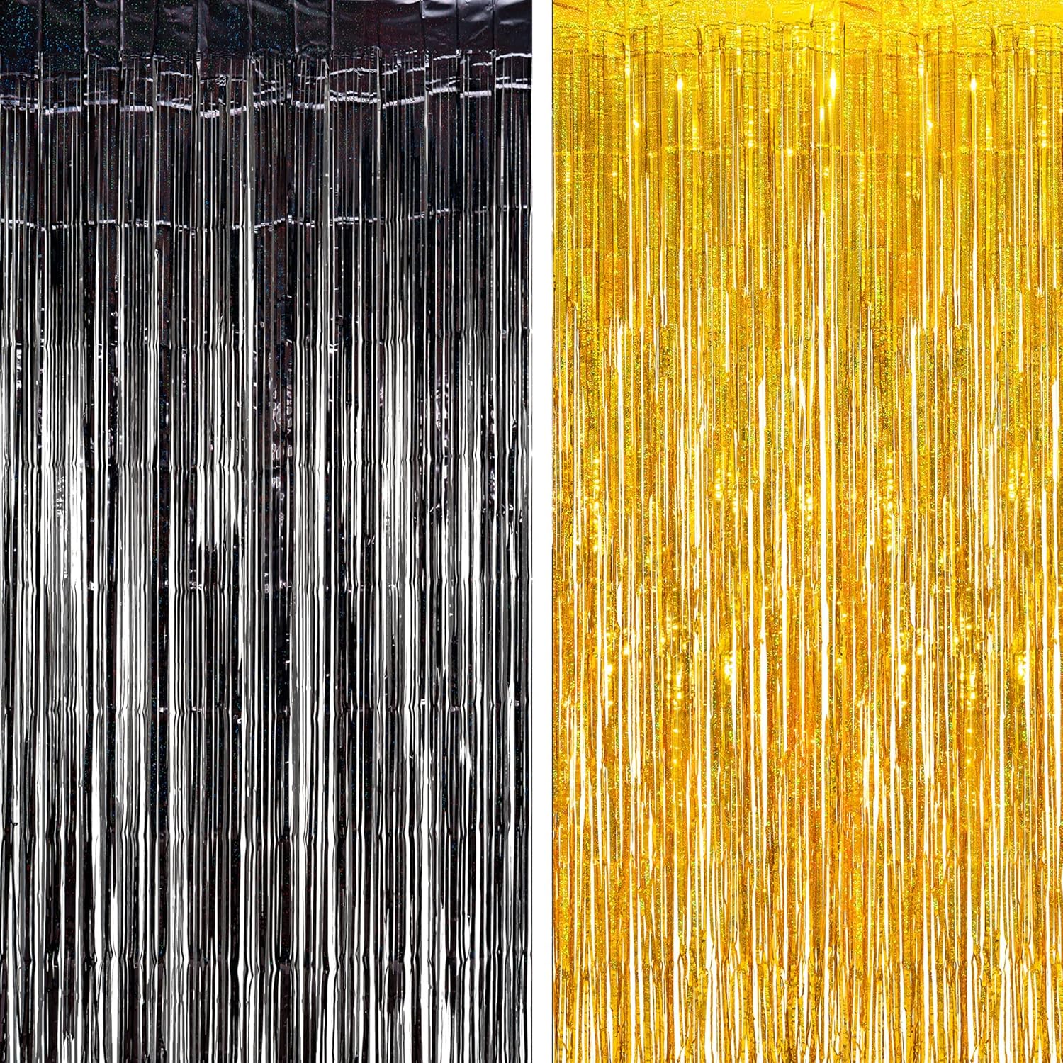 BRAVESHINE Black Gold Foil Fringe Curtain Backdrop - 2 Pack 3.2 x 8.2 ft Metallic Tinsel Photo Booth Streamers Curtains for 50th Birthdays Christmas New Years Anniversary Graduates Party Decorations