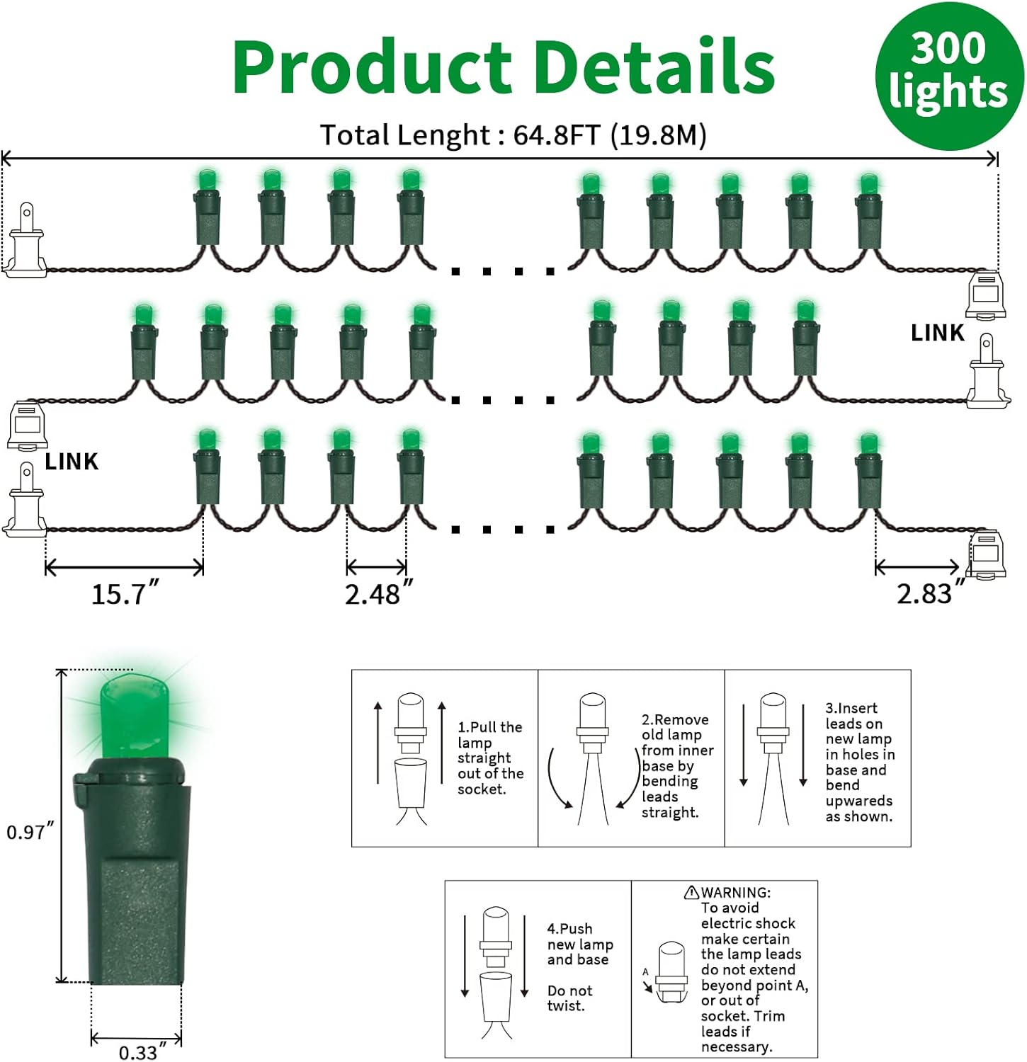• 3 STRANDS IN 1 PACK: 64.8ft 300 LED Lights (100 Lights 21.6ft 3 Groups), 5mm wide angle stable LED string lights spaced 6.3 inches apart with green wire.