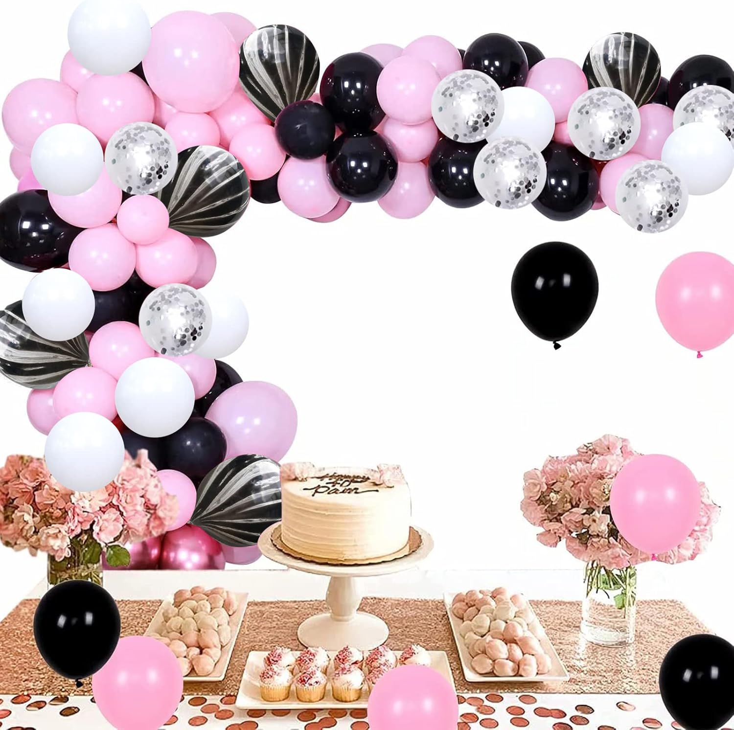 Balloons Black and Pink, 60 Packs 12 Inch Pink Black White Latex Balloon with Agate Balloon Silver Confetti Balloons for Girls Birthday Baby Shower Halloween Party