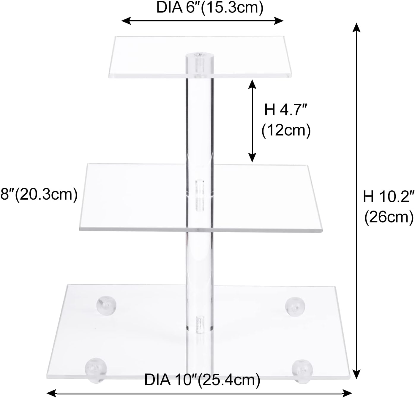 • โ™›[STRUCTURE]--- Overall size 10.2 x 10 inch (high x wide). The diameter of 3 tier plates : 6'', 8'', 10'' and the height between each plates: 4.7'' to provide enough space and height to showcase your cake and dessert. Each acrylic plate can be assembled freely or removed to be 3 or 2 tiers. Bonus designed drawstring pouch bag could be used to easy storage and environmentally friendly recycling.