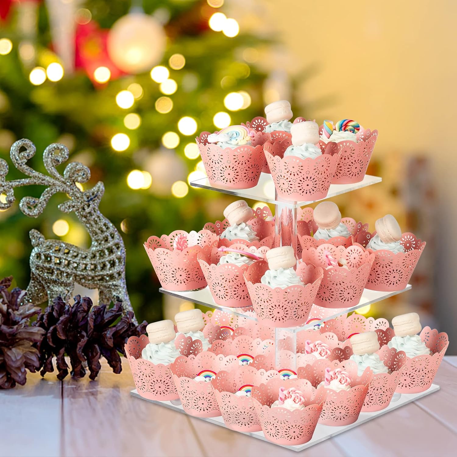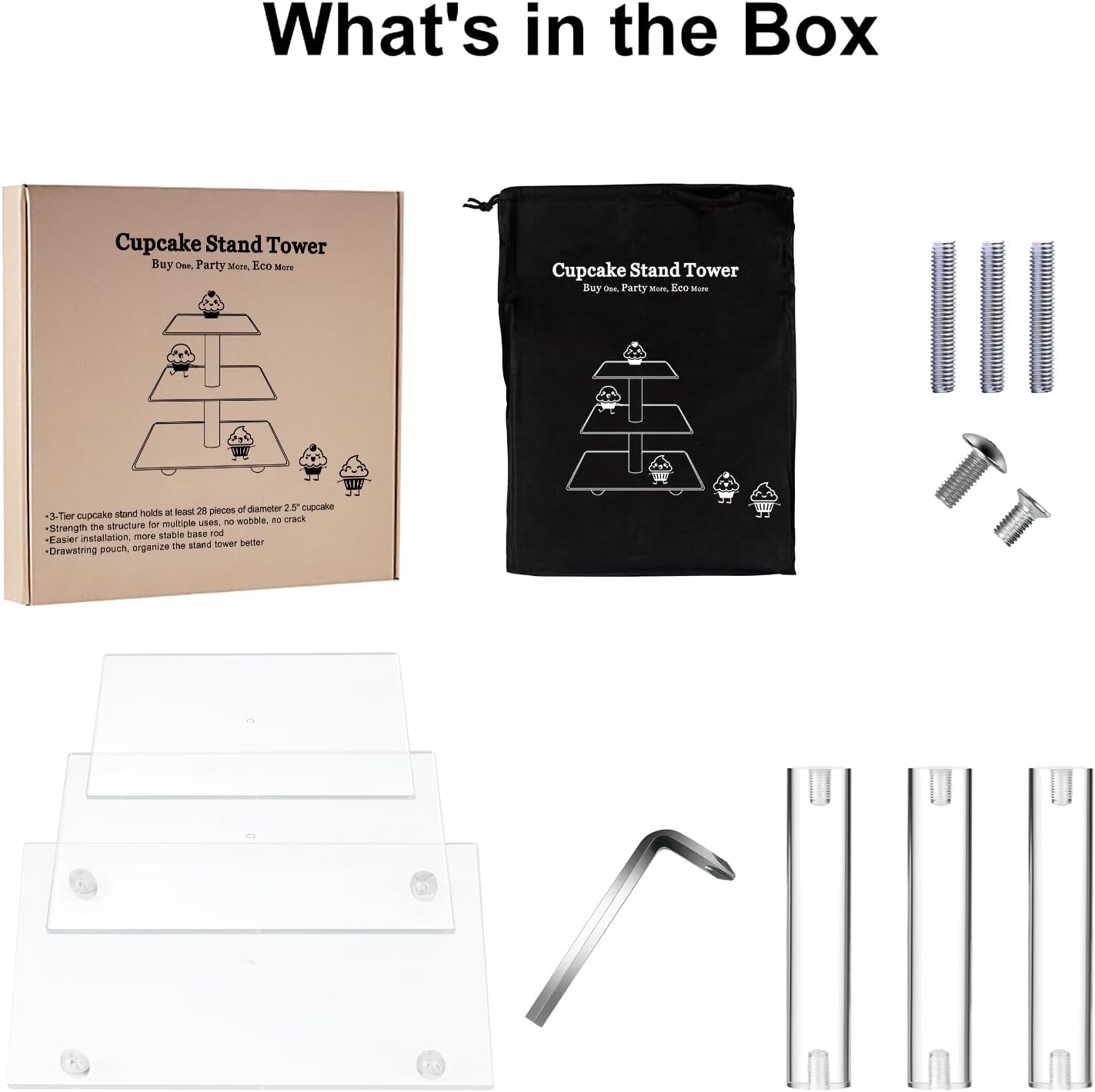 Boxalls Cupcake Stand, 3 Tier Square Acrylic Cupcake Display Stand Holder, Clear Dessert Pastry Tower for Wedding, Birthday, Theme Party, Baby Shower