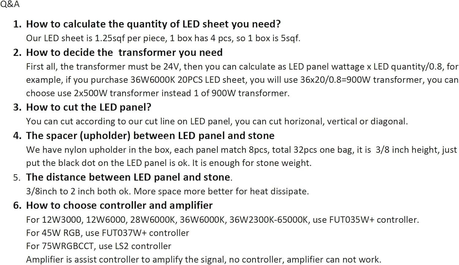 • What inside package. 4pcs led panel, it can cover 5 sqf, 8 pcs short connect line each is 3 inch length, 8 pcs long connector line each is 8 inch, 1 installation manual, 24pcs spacer. Transformer and controller is not included
