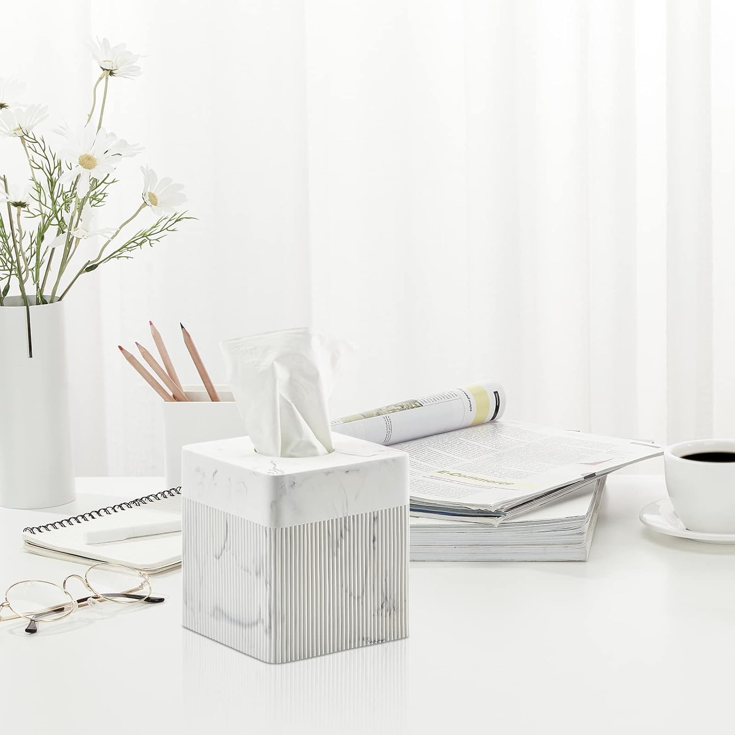 White Tissue Box Cover Square Resin Tissue Holder for Home Decor, Hand Poured Marble Ribbed Cube Tissue Box Holder – 5.5 Inch Heavy Duty Luxury Tissue Box Case for Bathroom, Living Room, Office