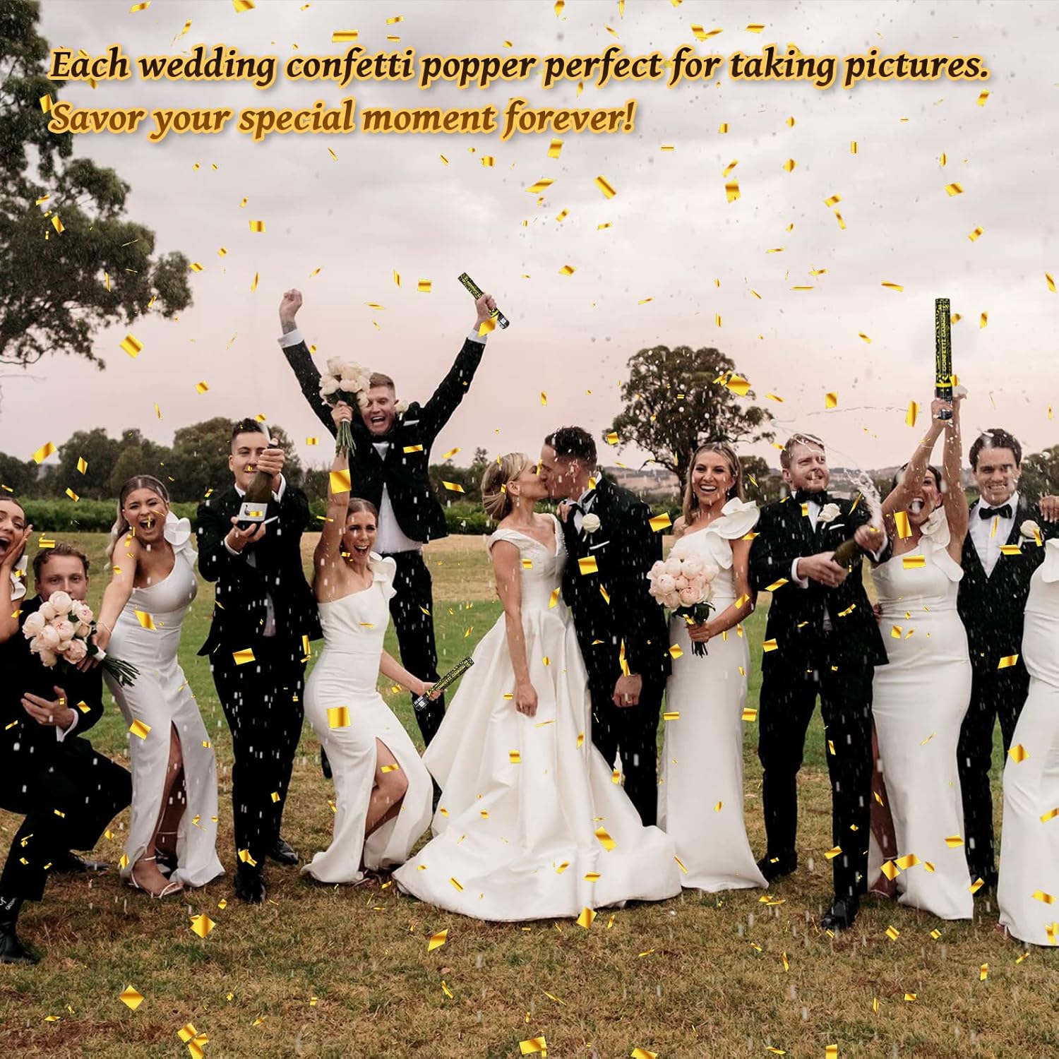 • 12 inch Confetti Poppers Gold - Each confetti cannon bulk includes 12 pcs high-quality confetti cannons filled with dazzling golden foil confetti,designed to add excitement and create unforgettable moments.Whether you're celebrating a wedding, birthday, graduation, or any festive event, these confetti poppers will bring the party to life!