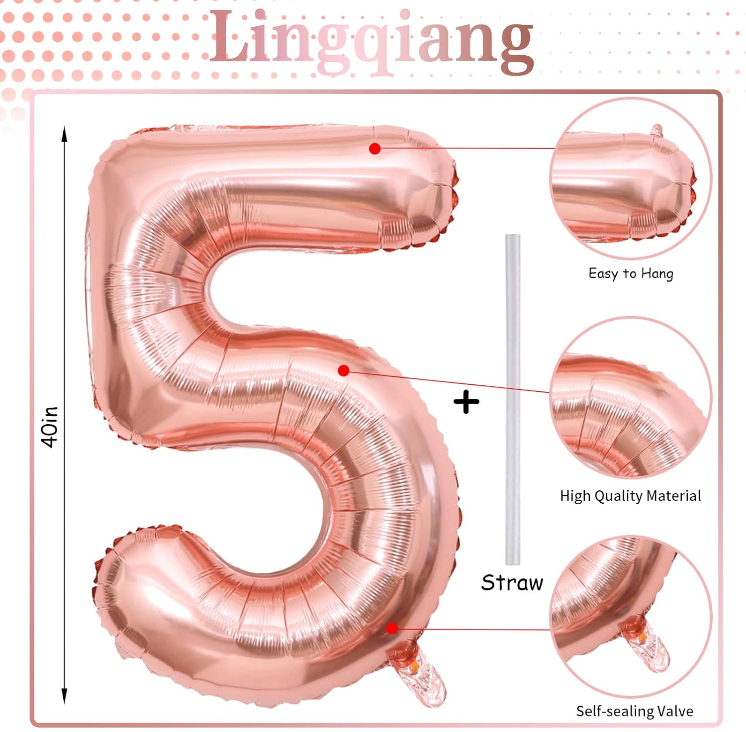 • πŸŽ‰ Rose Gold Number 5 Balloon πŸŽ‰ - You will get 1pc 40 inch mylar foil number 5 balloon and 1pc straw. Perfect for 5th 15th 25th 50th 45th birthday or anniversary party decorations supplies.