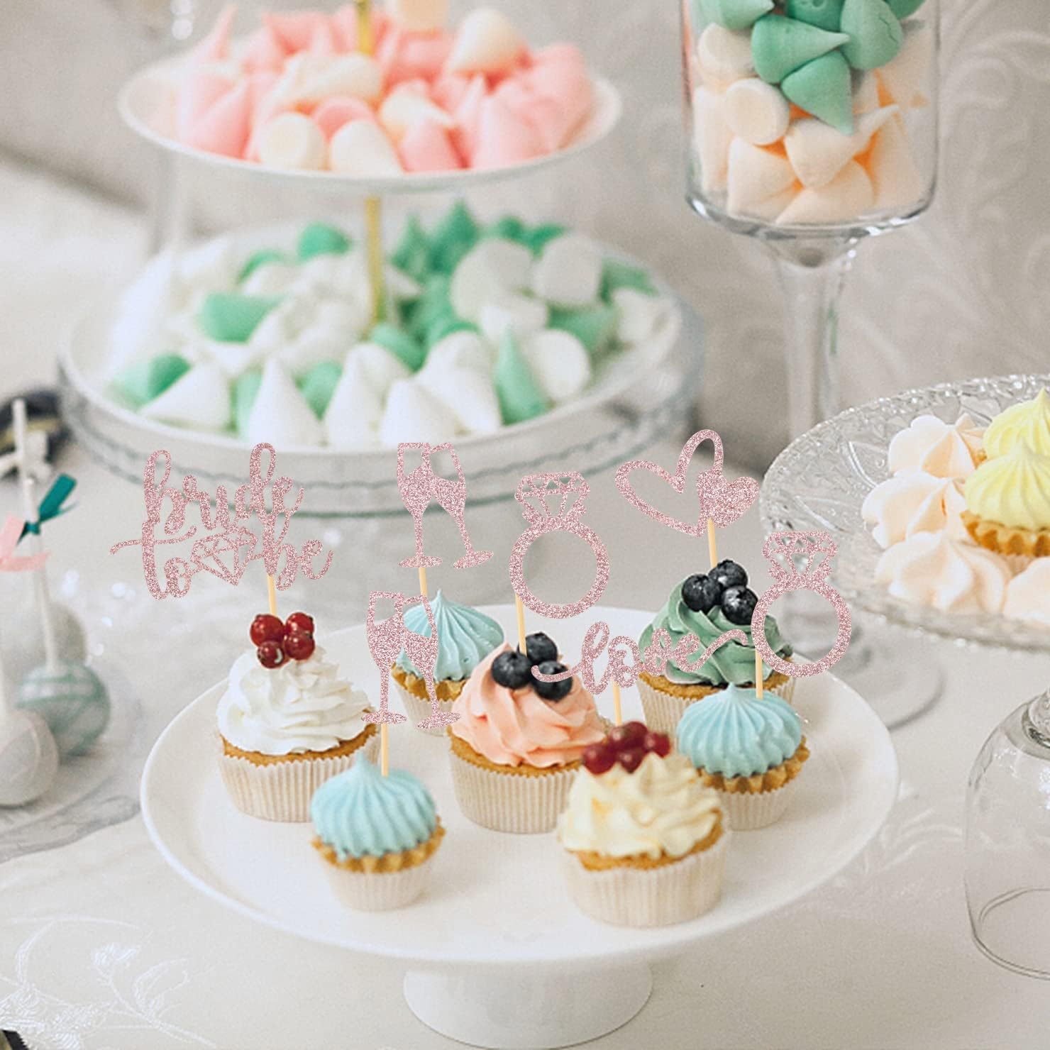 35 PCS Glitter Diamond Ring Bride to be Love Cupcake Topper Champagne Cake Picks Decorations for Bridal Shower Wedding Engagement Party Supplies, Rose Gold