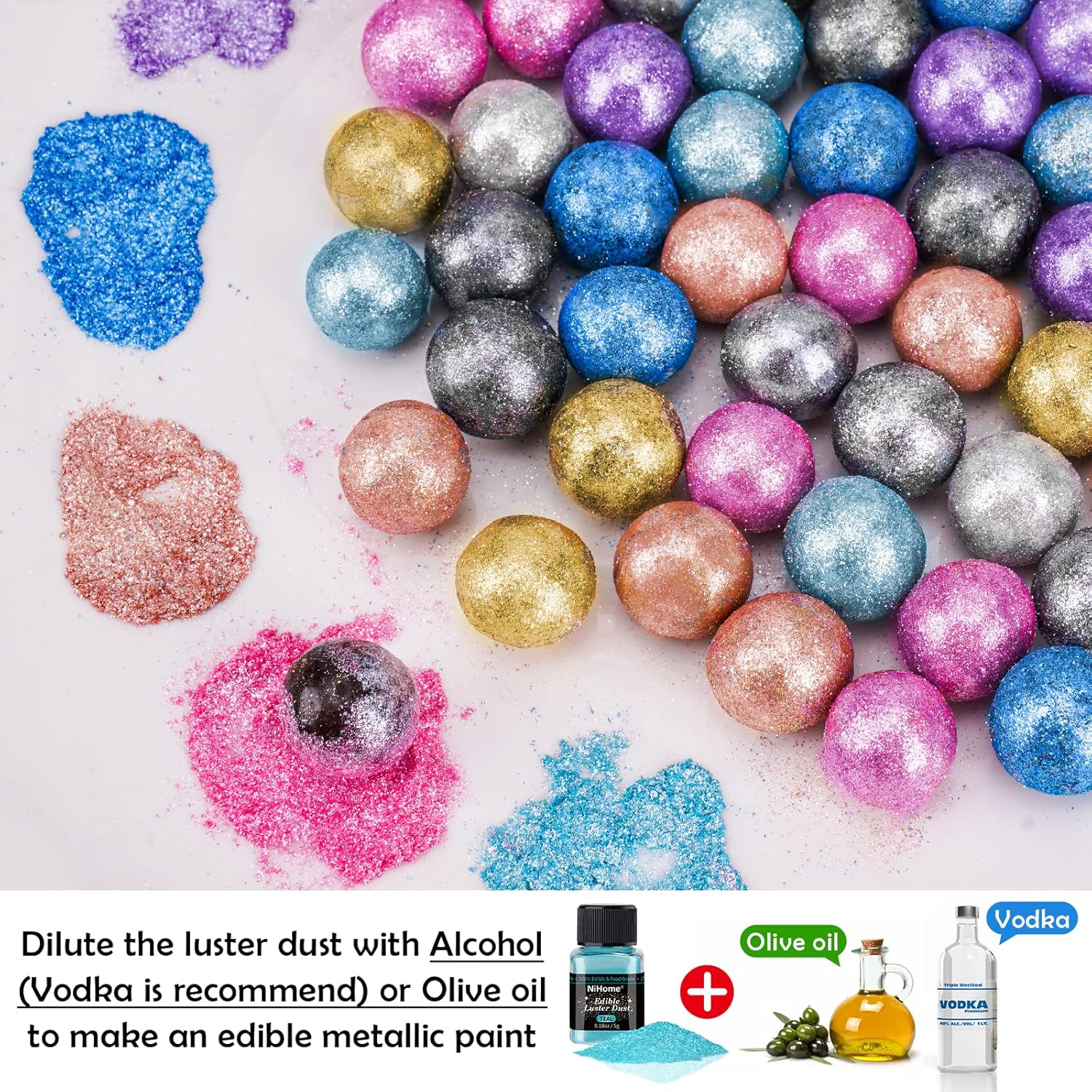 • ✔️【Easy to Use】Specially developed for food decoration and craft industries, this luster dust produces realistic looks by highly pigmented colors with a metallic finish. The pretty fine grain is more convenient for painting. To add glimmer and sparkle to your creations, simply sprinkle or dry brush the luster glitters on them. This product adheres very well to both wet and dry mediums. Attention: Seal and store glitter powder in a cool and dry place after use. Do not expose to excessive heat.