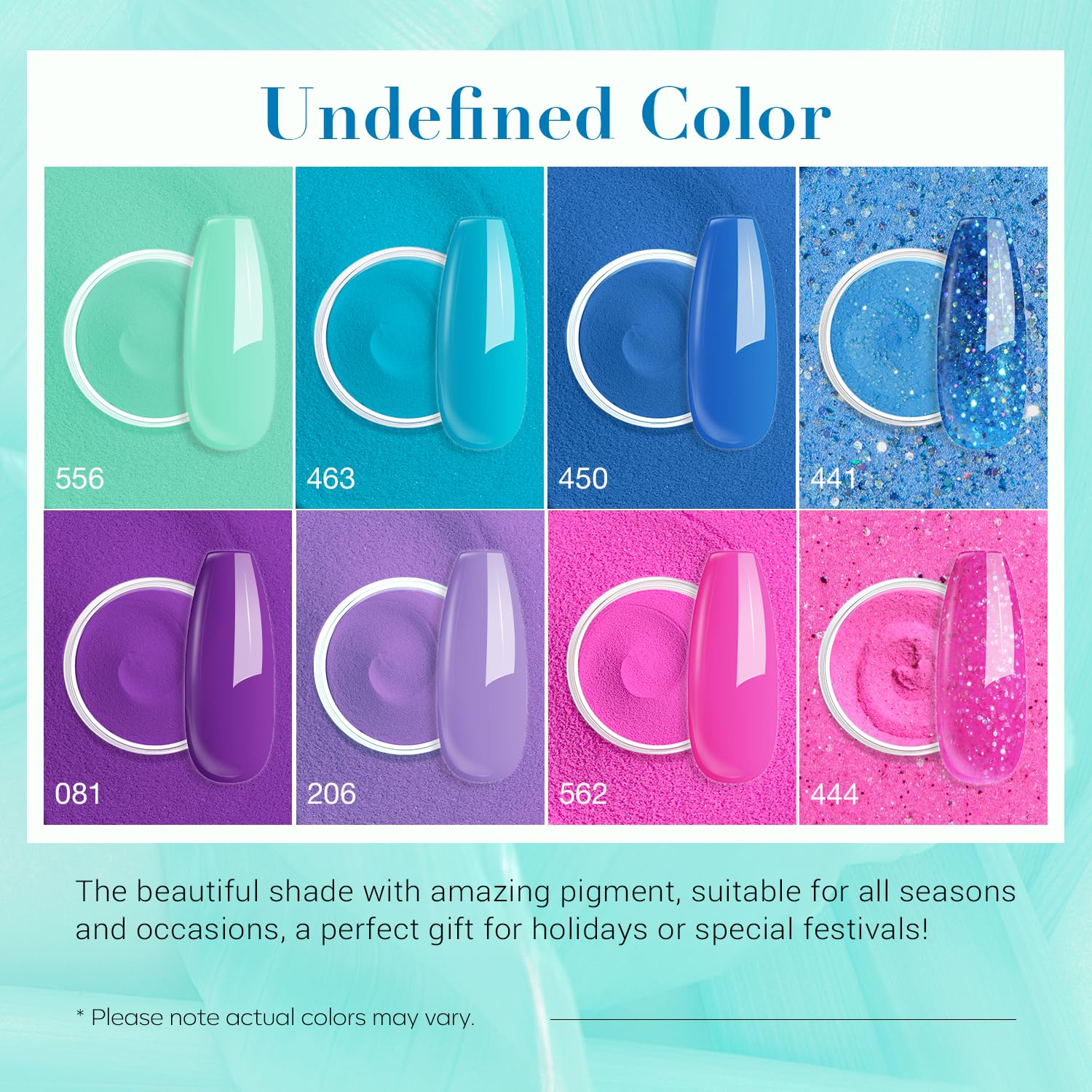 • 【New Dip Powder Nail Kit】Spring Vibrant Girl 8 colors series, including [hot pink, Blue, Green, Glitter], 4*10ml dip powder liquid set (base coat/activator/gel top/ matte top coat), 2 Nail brush replacement, 1 Nail brush, 1 Nail file, 1 Nail polishing block, 1 Dip Powder recycling tray. There are also 2 orange sticks for nails and 10 Nail Sticks for you to try colors.