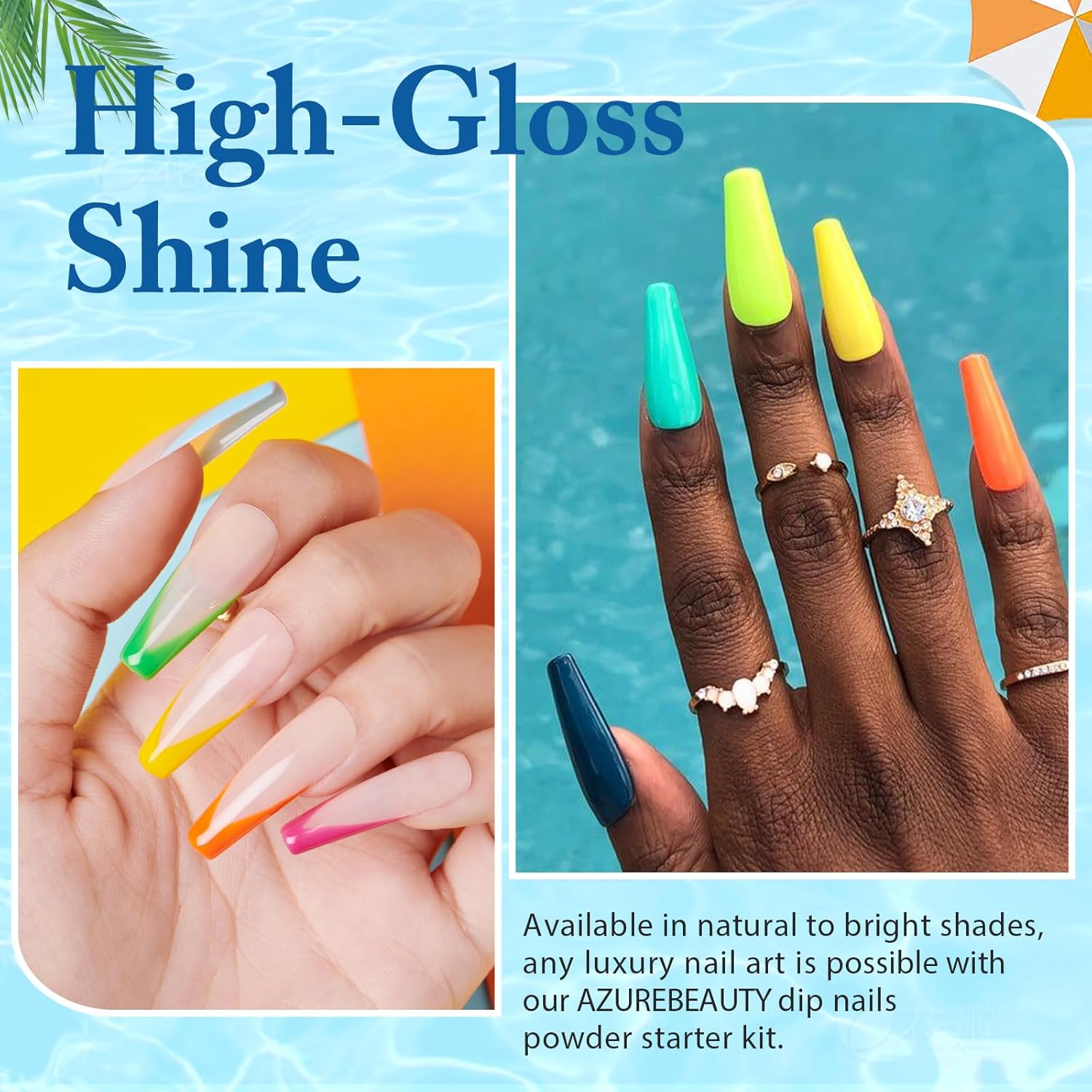 • 【Bright Neon Kit】AZUREBEAUTY All-New Dip Powder Nail Starter Kit includes 20 X Classic colors nail dip powder (0.34 oz. each), 4 X dip powder liquid set (with base coat/top coat/activator/brush saver, 0.34 oz. each), 7*additional professional dip manicure kit tool with 1*nail brush/1*cuticle pusher/nail file/2*dip powder gel brush replacement, 1*nail polishing block(Random color), 1*dip powder recycling tray, user manual quick start guide