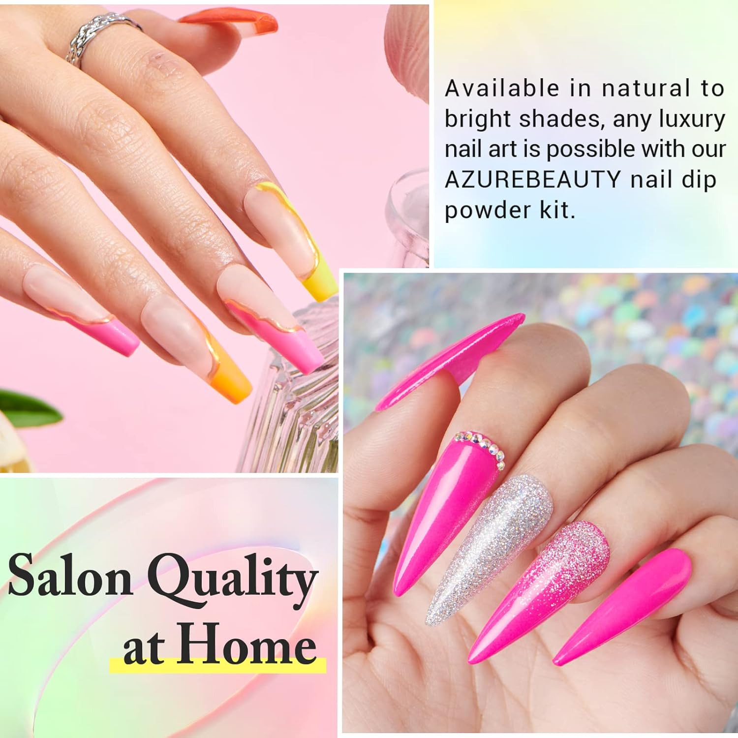 • 【Superior Quality & Long Lasting】 AZUREBEAUTY nail dip powder kit is long-lasting and anti-chipping, anti-peel off. The color is full and natural-looking, light, and has an impeccable shine finish. It can keep the nail art gorgeous and shiny for more than about 28 days with proper application. This makes it the first choice for busy people. (REMINDER: The affection of dip powder may show differently in different people, 2~3 base coats while using will be the best.)