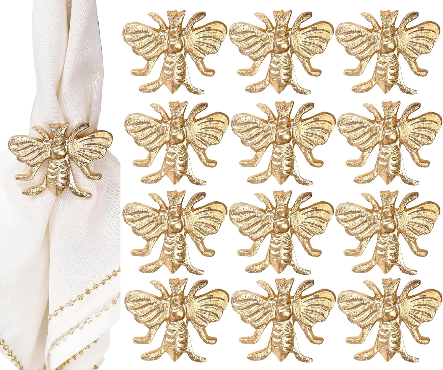 Gold Napkin Rings Set of 12 - Elegant Bee Napkin Rings with Sturdy Lightweight Metal Design - Durable & Versatile for Table Settings, Special Occasions, Decor & Gift Giving Ideas - CLEENTABLE