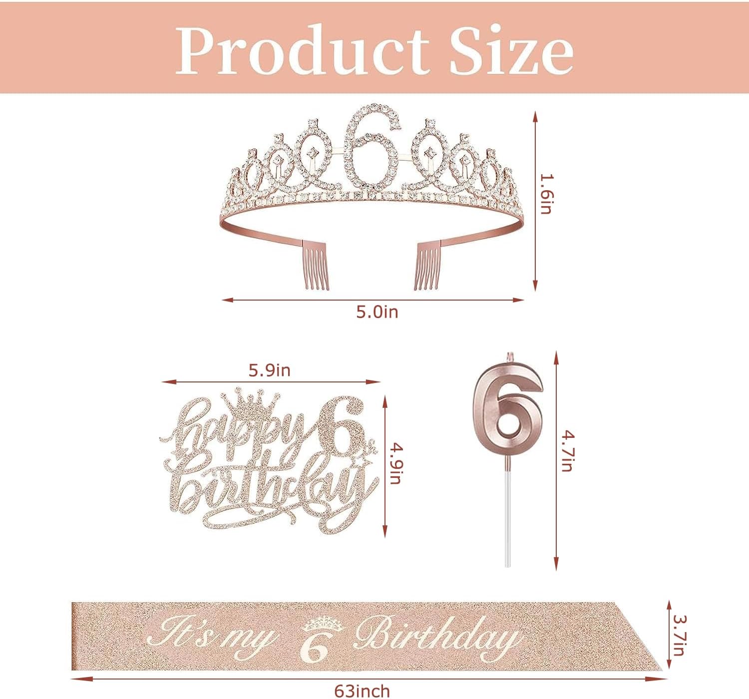 6th Birthday Decorations for Girl Including Sash, Crown, Numeral Candle and Cake Topper, 6 Year Old Birthday Decorations Rose Gold Party Favor Supplies