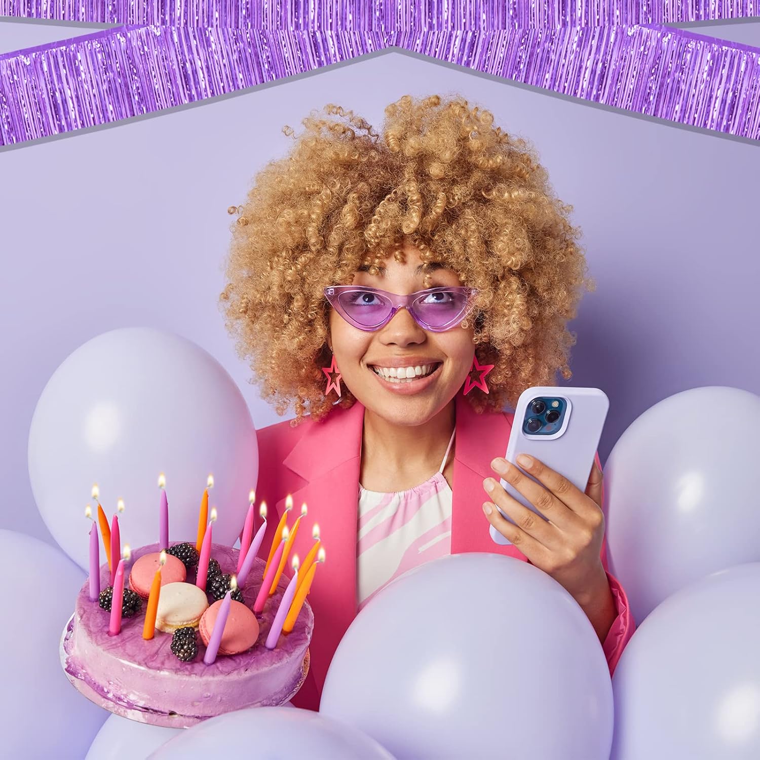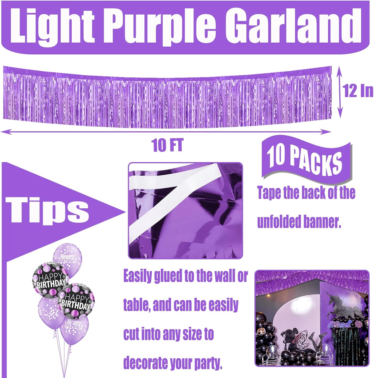 10 Pack 10 Feet Foil Fringe Garland Metallic Tinsel Streamers Banner Wall Hanging Curtain Backdrop for Parade Floats, Wedding, Disco, Birthday, Halloween, Christmas Party Decorations(Light Purple)