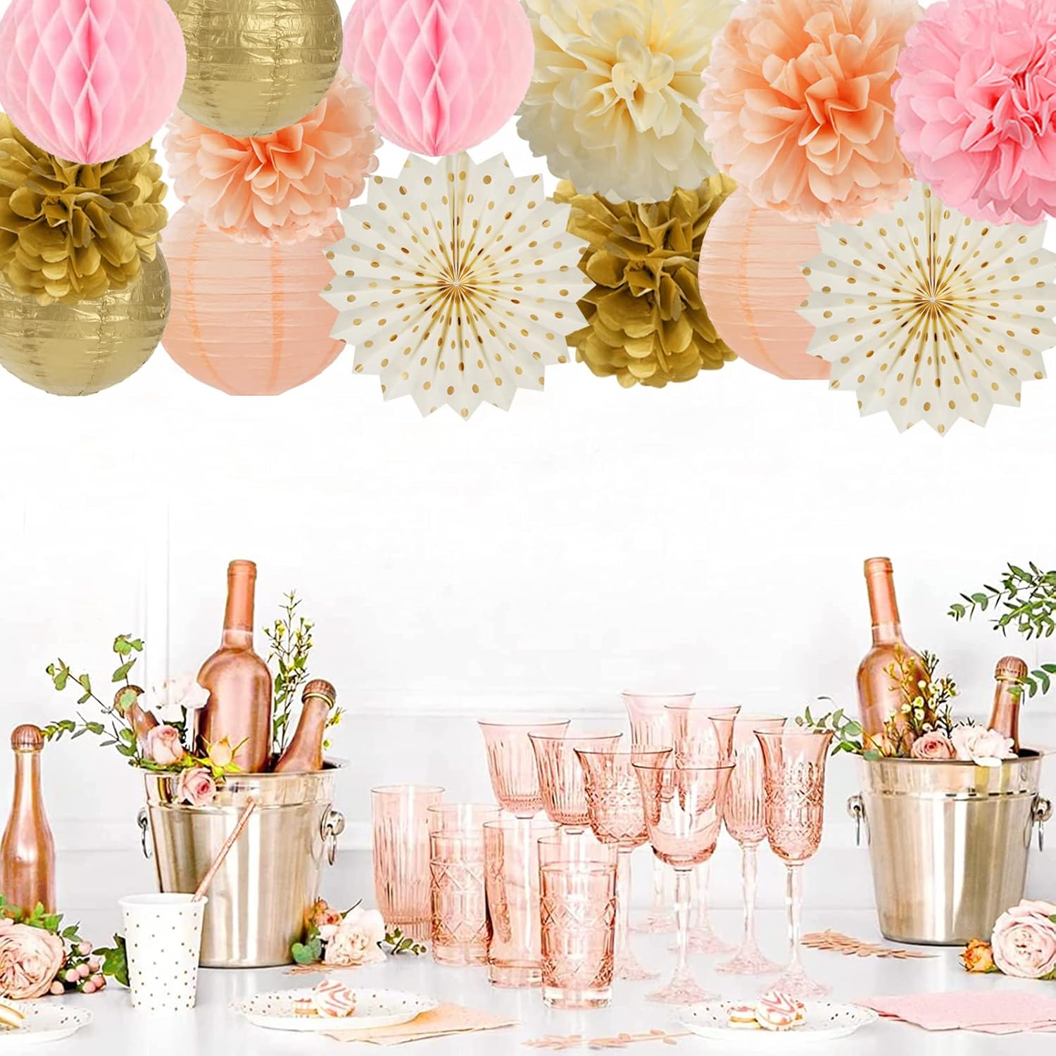 Pink Peach Gold Party Decorations - 14pcs Bridal Baby Shower Girls Birthday Paper Lanterns Fan,Tissue Pom Poms Streamers,Honeycomb Balls,Engagement Wedding Bachelorette Brunch Decor Lasting Surprise
