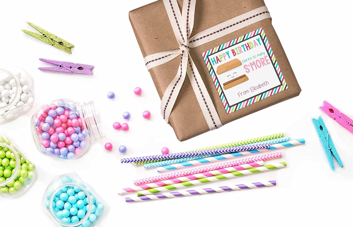 Custom & Personalized Many S'More Happy Birthday Gift Tag Sticker Labels, 24 2.5" Square Stickers by Amanda Creation