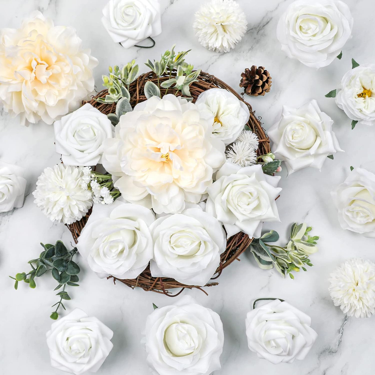 AmyHomie White Artificial Flowers Combo Silk Mix Peony Rose Hydrangea Daisy Fake Flowers w/Stem for DIY Wedding Bouquets Centerpieces Arrangements Table Decor Party Bridal Baby Shower Home Decor
