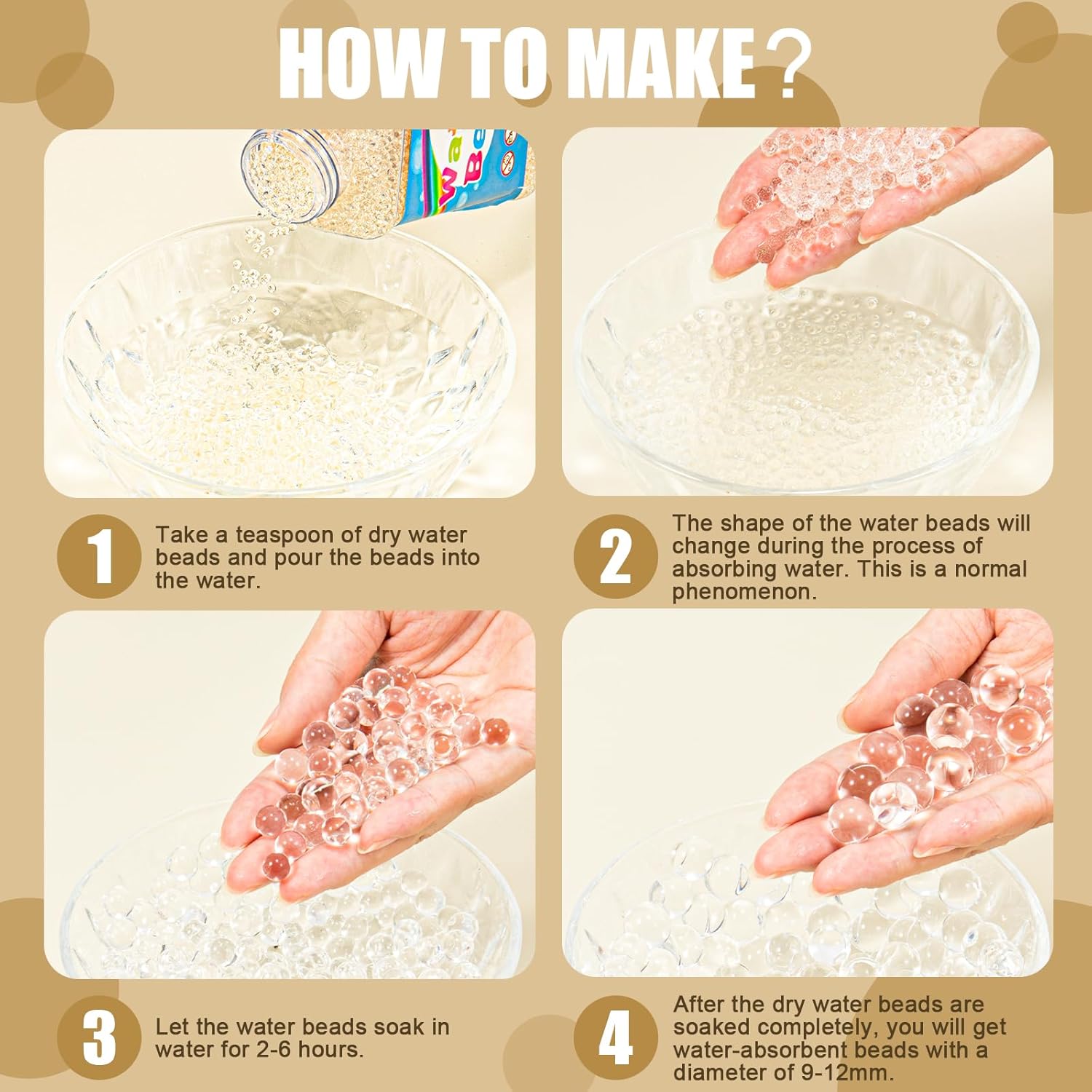 • Easy to Use: Take out the dry water gel beads from the packaging bag and soak them in water for 1-3 hours, and you will get the fully expanded water beads!