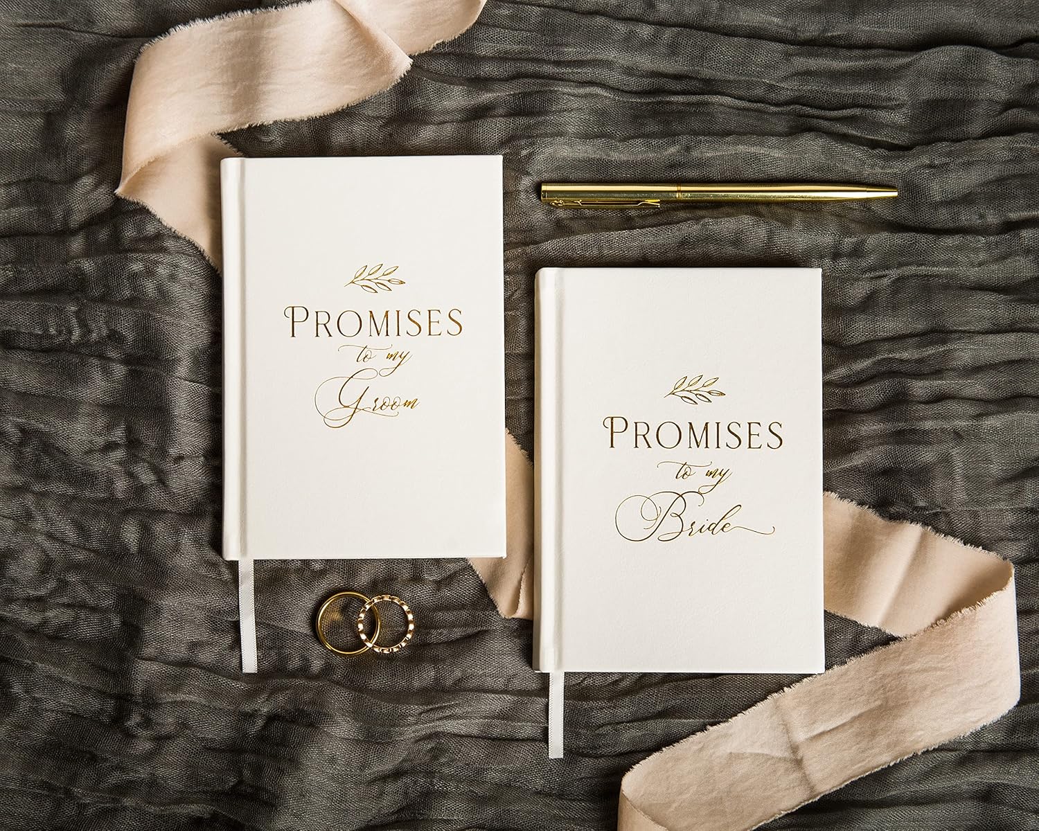 • A set of two hardcover vow books made of quality PU leather with a gold foil embossed design "Promises To My Groom" and "Promises to My Bride". Each notebook has a dimension of 5.75 x 4 x 0.5 inches and contains 80 lined pages with gold gilding on the edges.