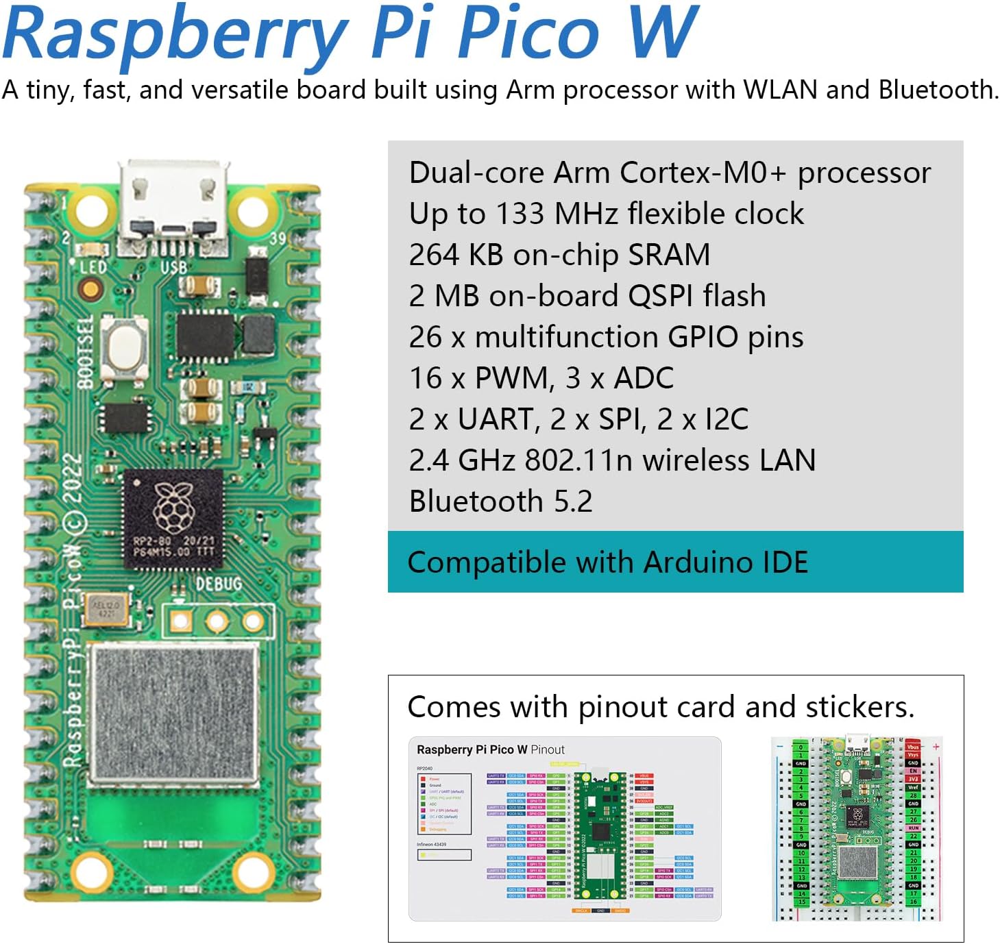 • Raspberry Pi Pico W: A tiny, fast, and versatile board built using dual-core Arm Cortex-M0+ processor with wireless LAN and Bluetooth
