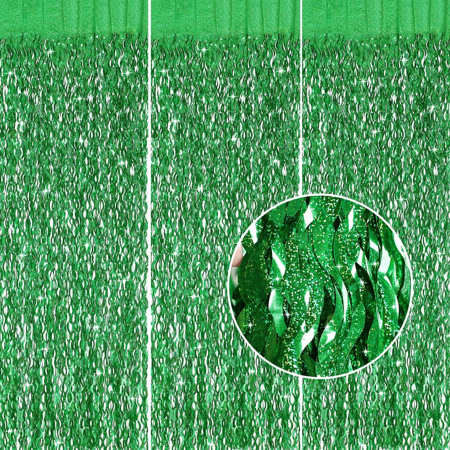 Green Foil Backdrop Curtain - CYLMFC 3 Pack 3.3 ft x 6.6 ft Birthday Streamers Party Curtains Decorations Backdrop Xmas Graduation Decor