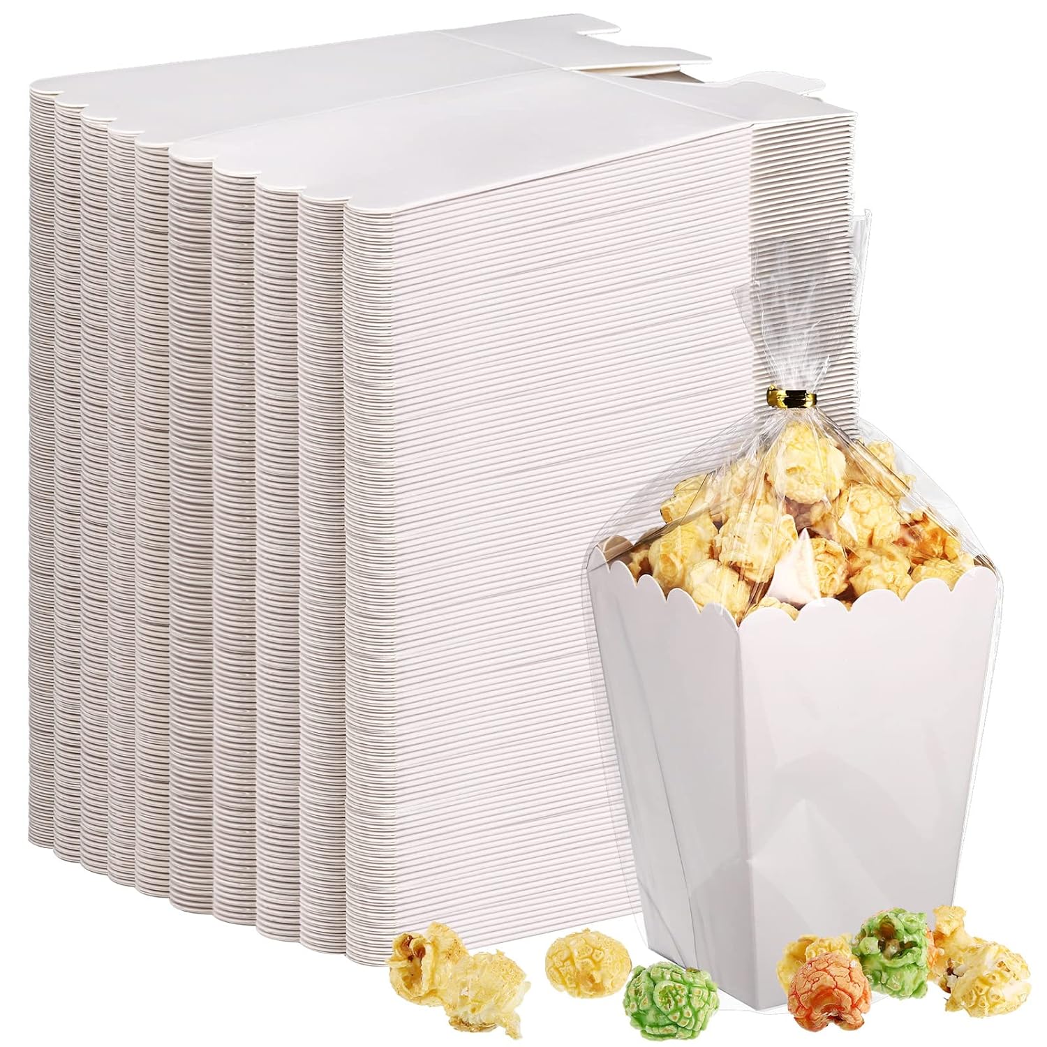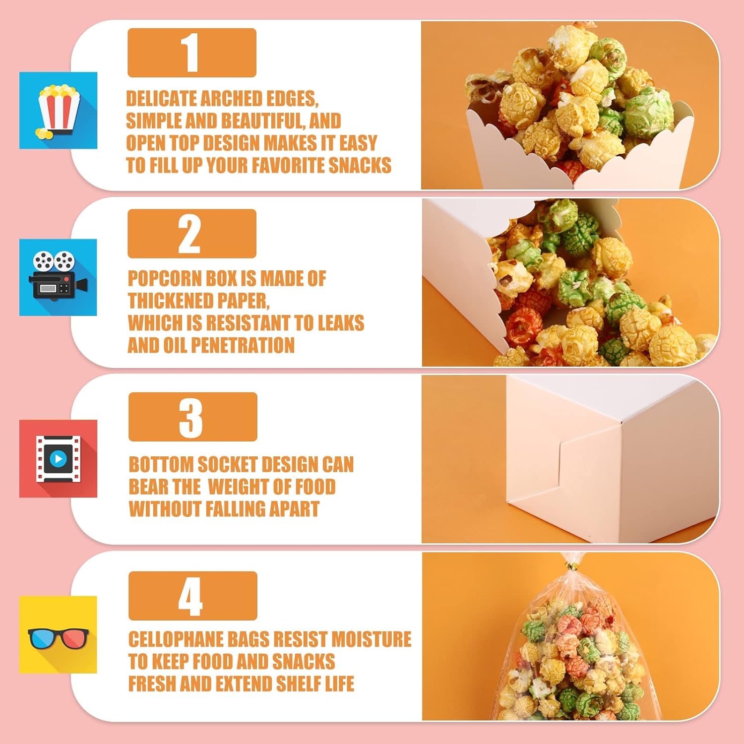 • Abundant Quantity: you will receive 100 pieces of flat pack white popcorn boxes and 100 clear cellophane bags; Sufficient quantities and nice combination can meet your multiple needs for packaging food at parties and family gatherings and enjoy life