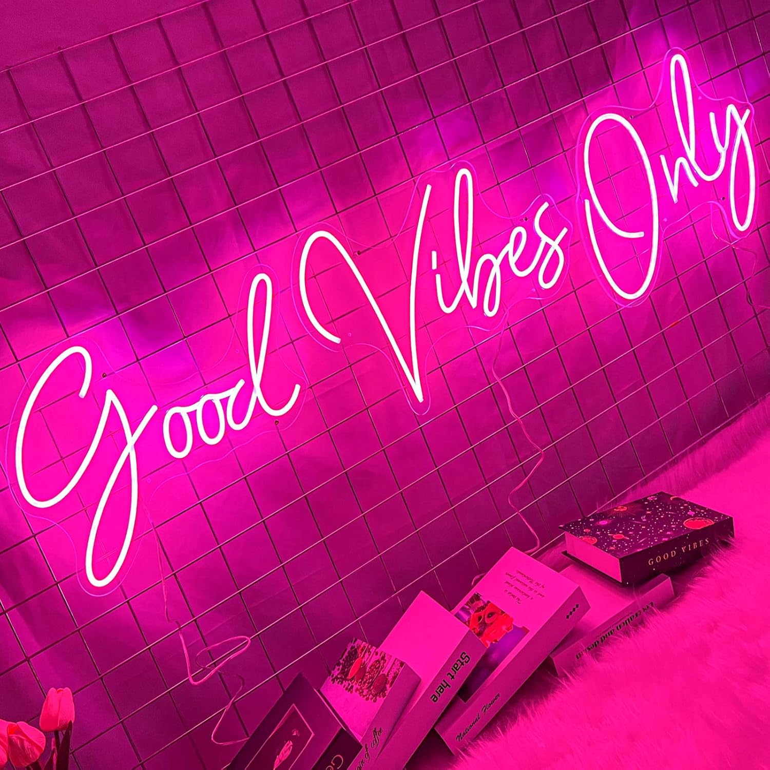 • 【Easy to Use】Good Vibes Only neon sign, size: 56.57x13.54in, neon sign includes adapter, power cord, dimmer switch, chain, hanging ring, nail, LED neon signs is light weight, with small holes on the back panel, it can be easily installed, You can quickly hang or fasten it to a wall, or place it anywhere flat.