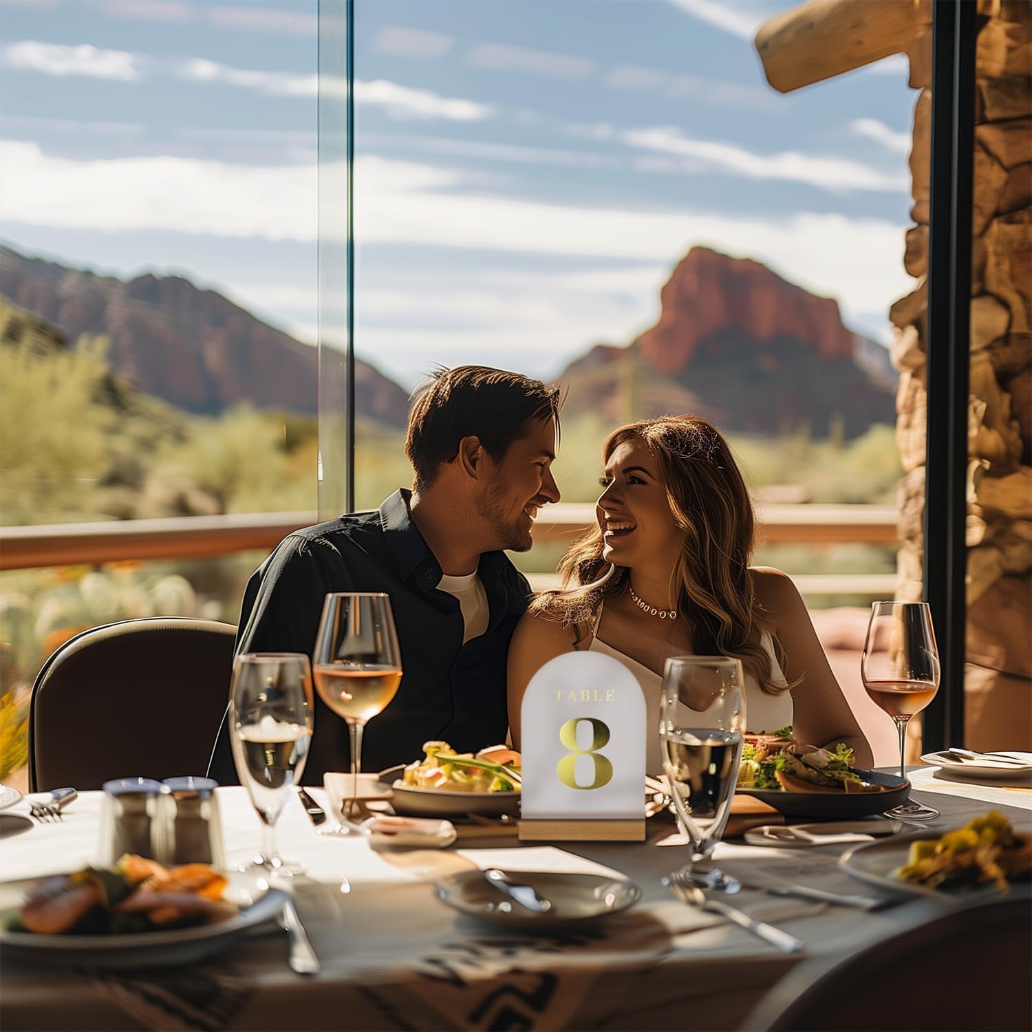 • DELICATE DESIGN - Glass-look acrylic is all the rage! Our frosted arch-shaped acrylic blanks paired with stands add a stylish and modern look to your event. The combination of the sturdy, wide wooden base and the acrylic blank ensures that any table number, card, or photo you create and display will always be upright during your event. They form the perfect foundation for creating gift table signs, picture displays, or wedding card holders.
