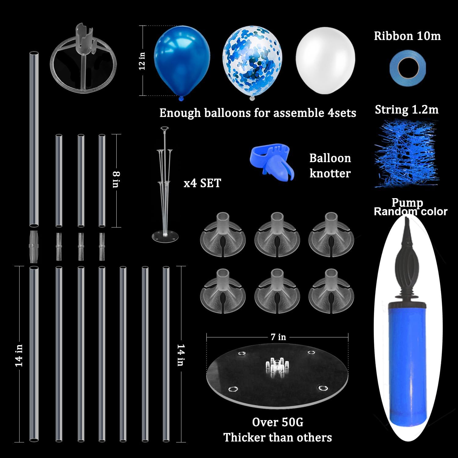 • WHAT INLCUDE: This balloon stand kit include 4 set balloon holders, 35 pcs balloons - blue and confetti balloons, white balloons, balloon pump, ribbons, glue dots and tie tool