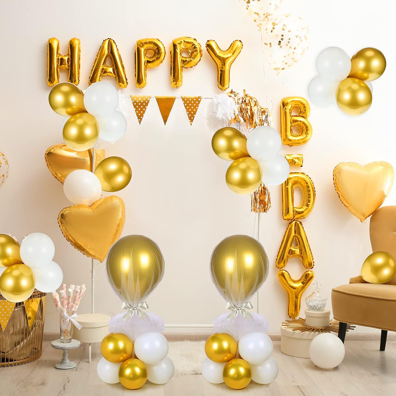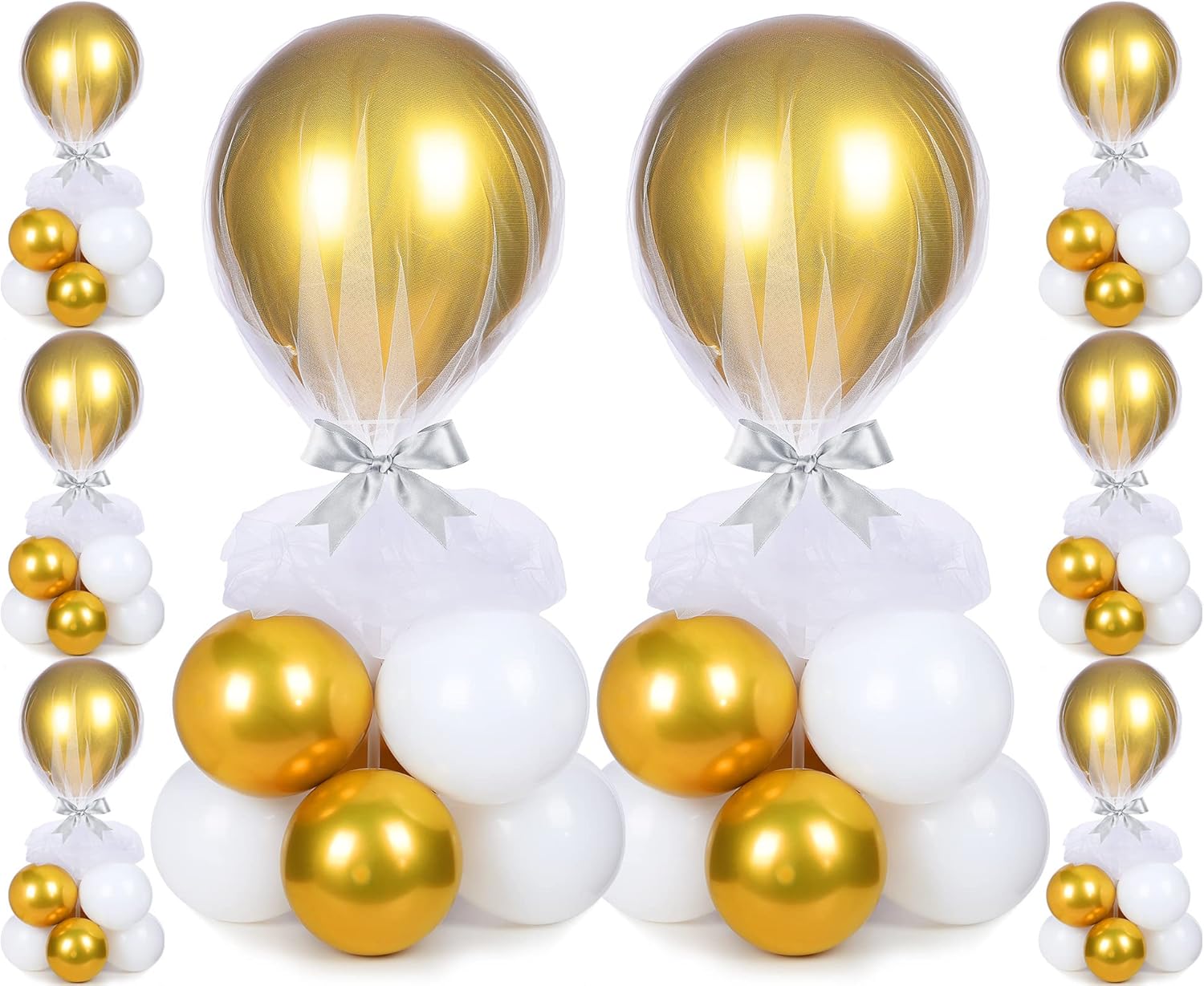 • What You Get: you'll receive a nice value balloon pack that includes 8 reusable tabletop balloon sticks, 8 balloon flower bases, 16 round snaps, 8 white gauze covers, 8 balloon fixed holders, 72 pieces of 5 inch latex balloons (36 white and 36 gold), 8 pieces of 12 inch gold latex balloons and 8 pieces white thick ribbons